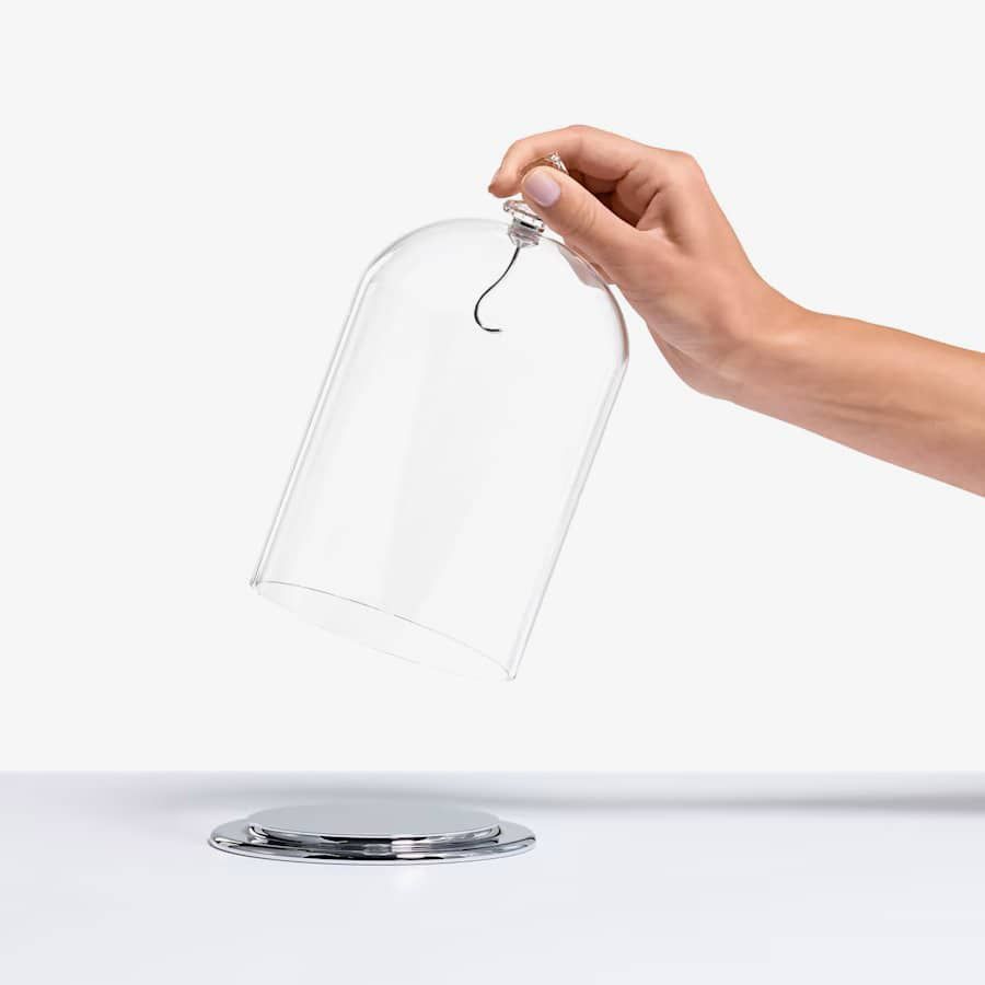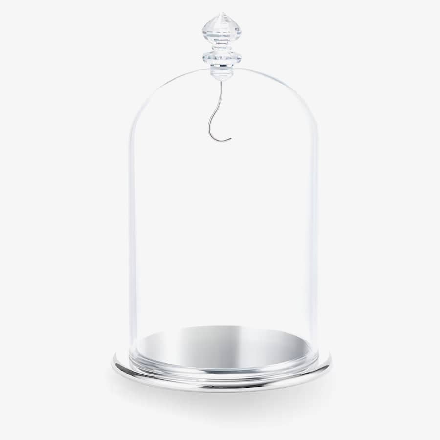 This Swarovski bell jar provides an ideal way to showcase your most special ornaments and crystal creations. The jar features a high-quality glass bell, adorned with a sparkling clear crystal handle boasting 230 facets, and it comes with a polished stainless steel hook on a metal base. The hook can be removed, allowing you to spotlight your most precious Swarovski figurine.
