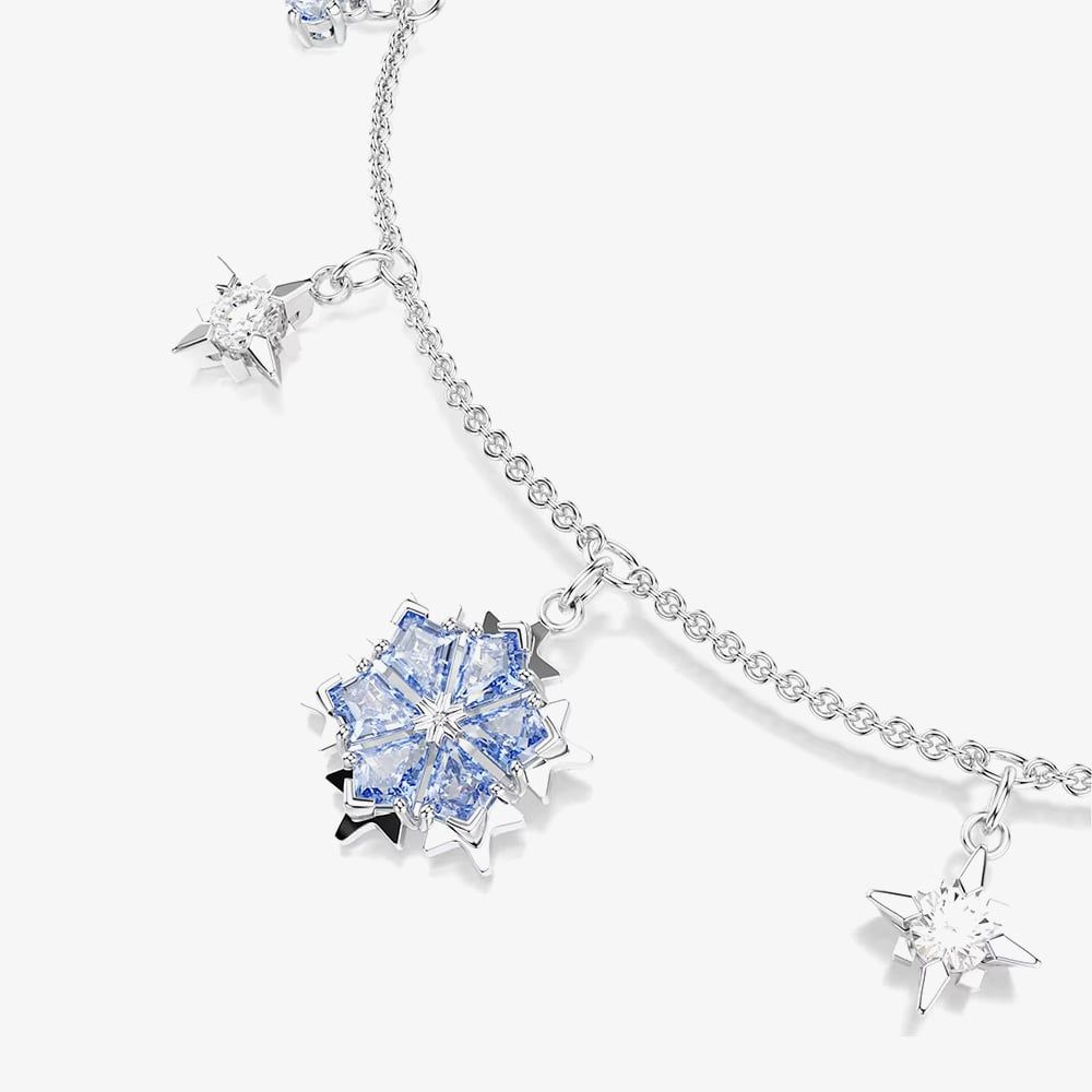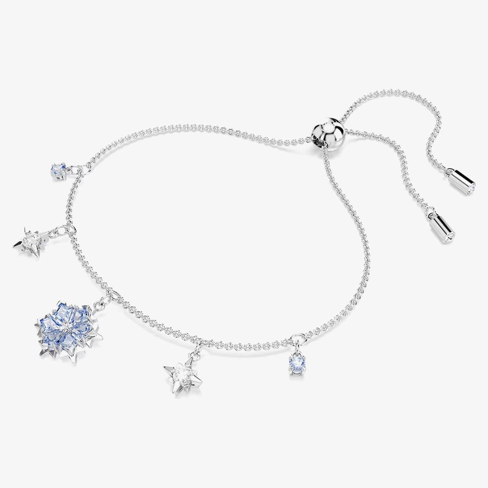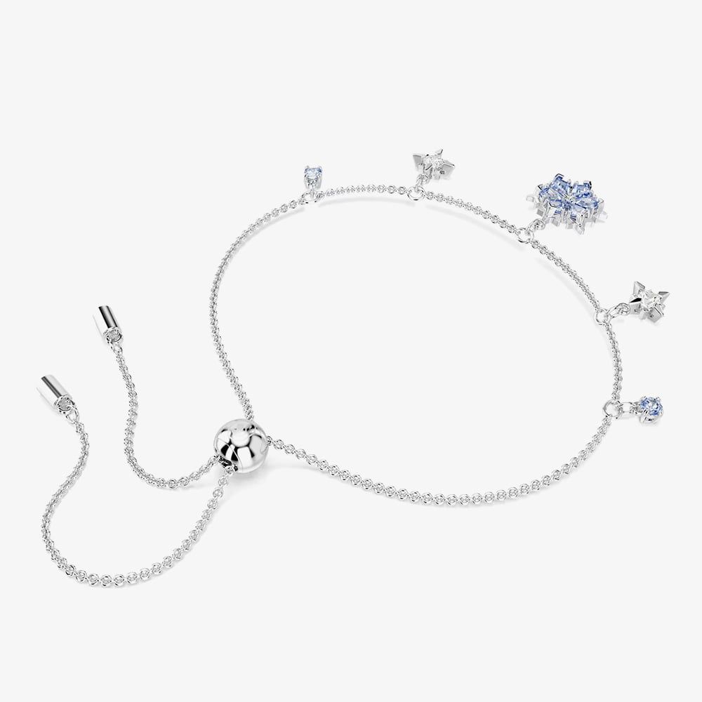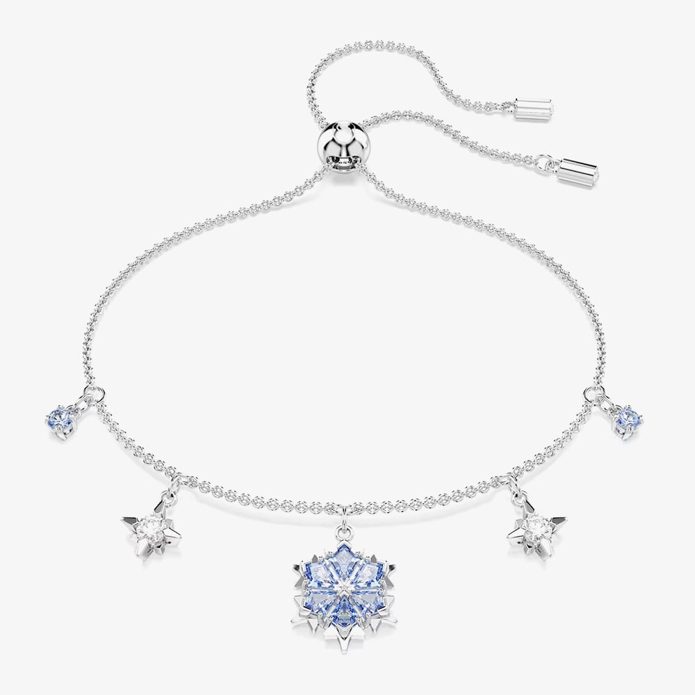 Inspired by Swarovski’s iconic snowflake, this rhodium-plated bracelet features five wintry motifs adorned with brilliant blue Swarovski Zirconia. Set on a delicate chain with an adjustable sliding closure, it’s a dazzling piece for your collection or a thoughtful gift.