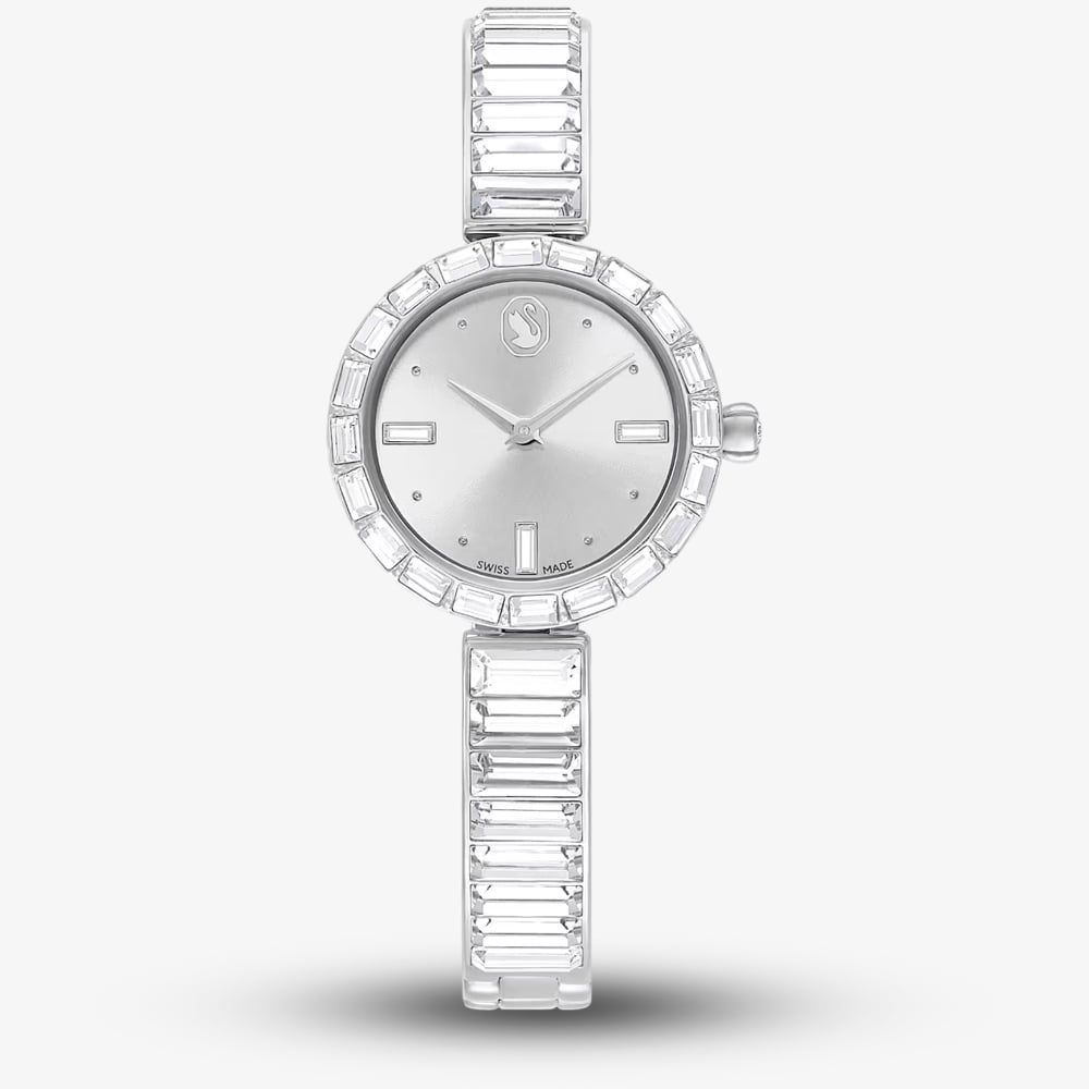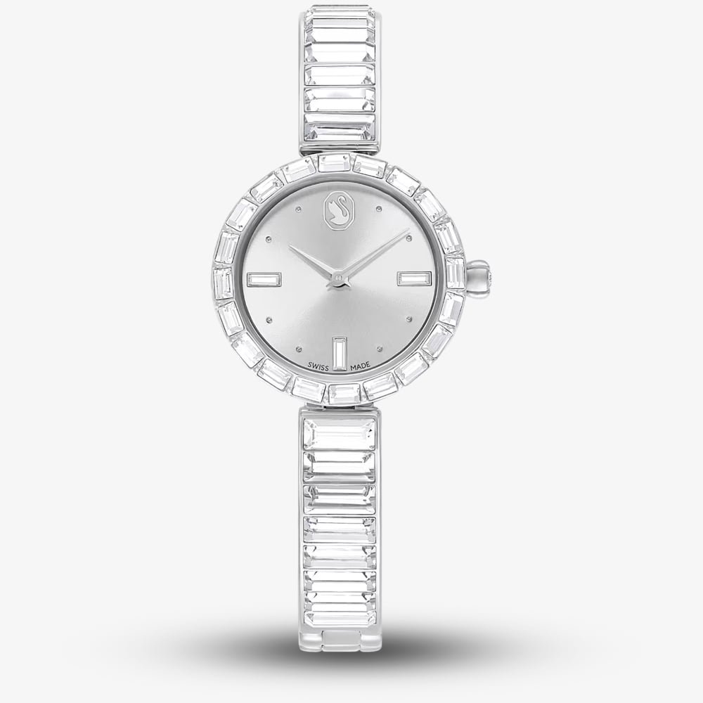 This stunning jewellery inspired timepiece amplifies elegance with its crystal accents. The 25mm stainless steel case is surrounded by a bezel set with 20 baguette-cut clear crystals, and a single crystal is set within the crown. The silver-tone dial is highlighted by three index markers adorned with baguette-cut crystals, and features a swan logo at 12 o'clock. The bangle-style bracelet, adorned with 16 baguette-cut crystals, is fully adjustable for a comfortable fit. This Swiss-made watch is water-resistant up to 50 meters, making it the perfect accessory to illuminate every aspect of life.