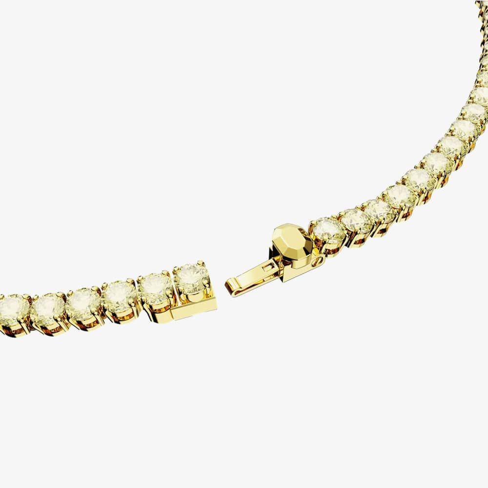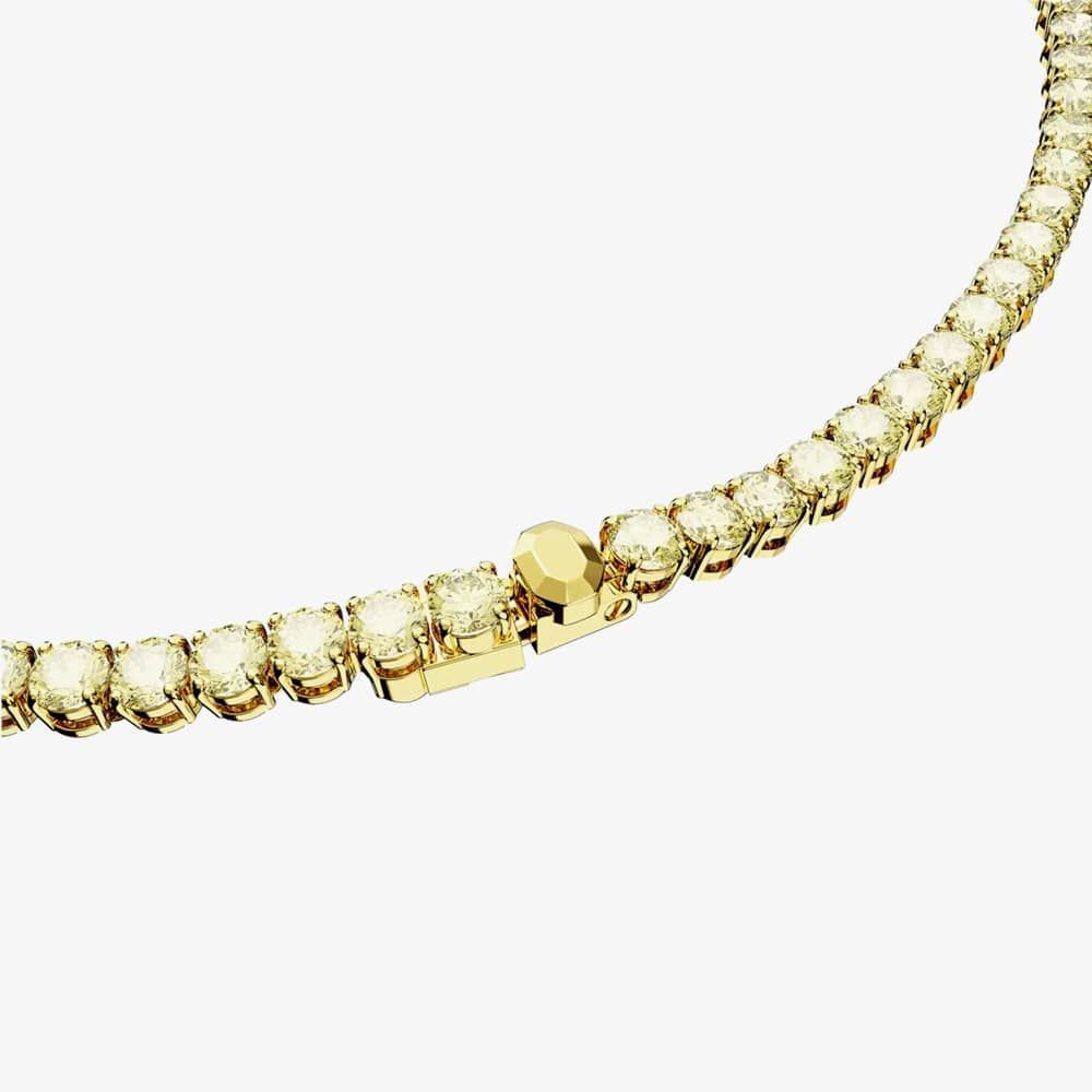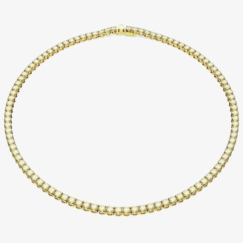 The Swarovski Matrix Yellow Tennis Necklace is delicately crafted from base metal with yellow gold-tone plating. This beautiful tennis necklace is adorned with yellow brilliant-cut cubic zirconia stones set in a four-claw setting and is a size medium. Width: 0.4cm.