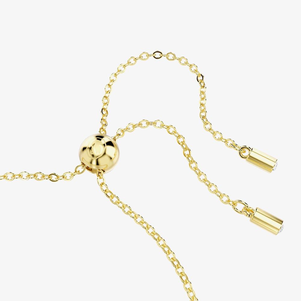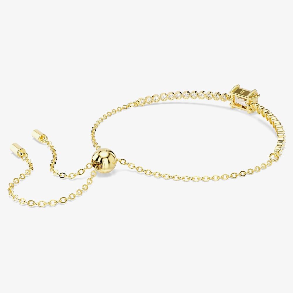 Elevate your everyday style with this gold-tone plated tennis bracelet, featuring a sleek, adjustable sliding clasp for a perfect fit. The design showcases a continuous row of brilliant Swarovski Zirconia, highlighted by a striking baguette-cut caramel Swarovski Zirconia at the centre. A refined blend of classic elegance and modern charm.