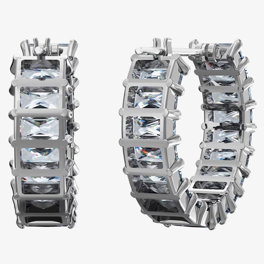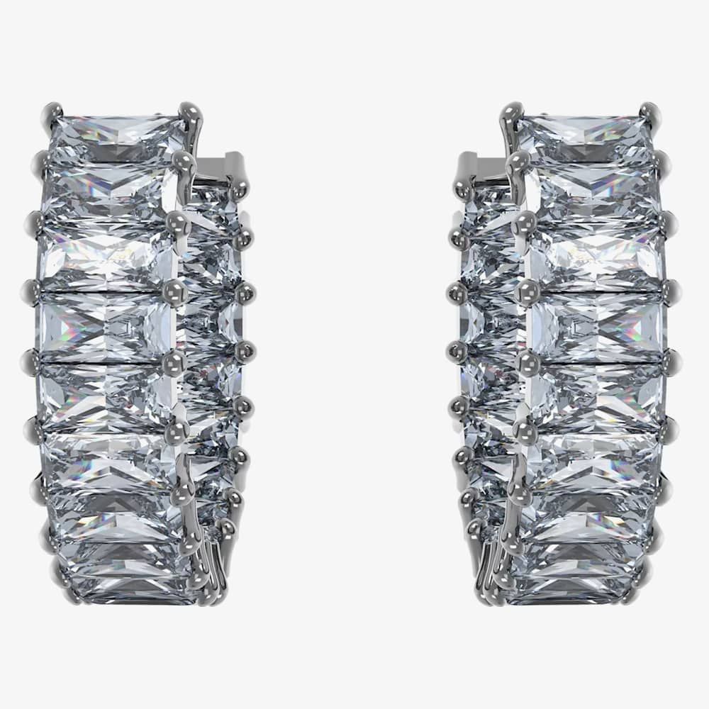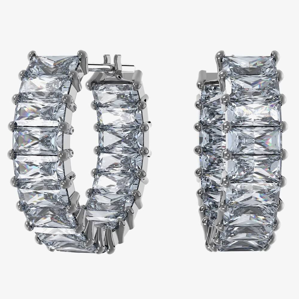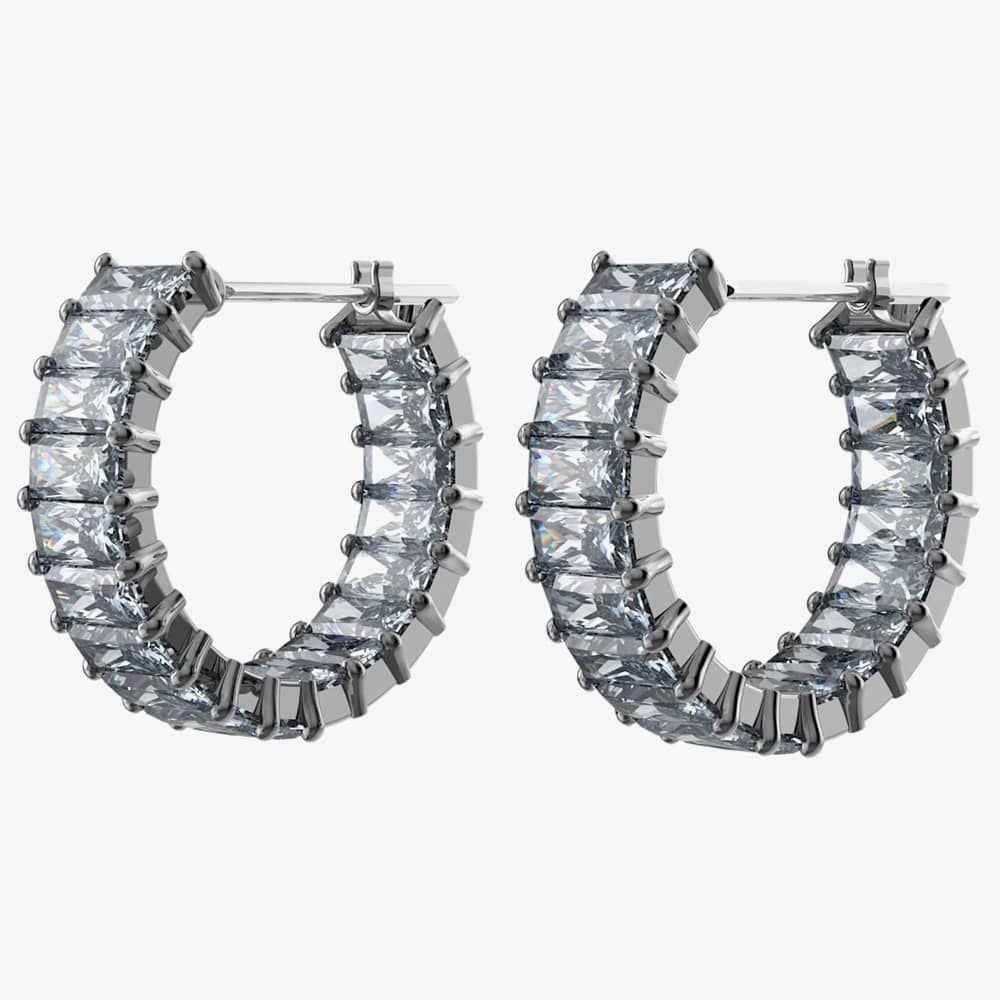 The Swarovski Matrix Grey Hoop Earrings are delicately crafted from base metal with a ruthenium plating. These elegant hoops feature a circle of baguette princess-cut grey Swarovski crystals set in a four-claw setting and are secured with a post fastening.