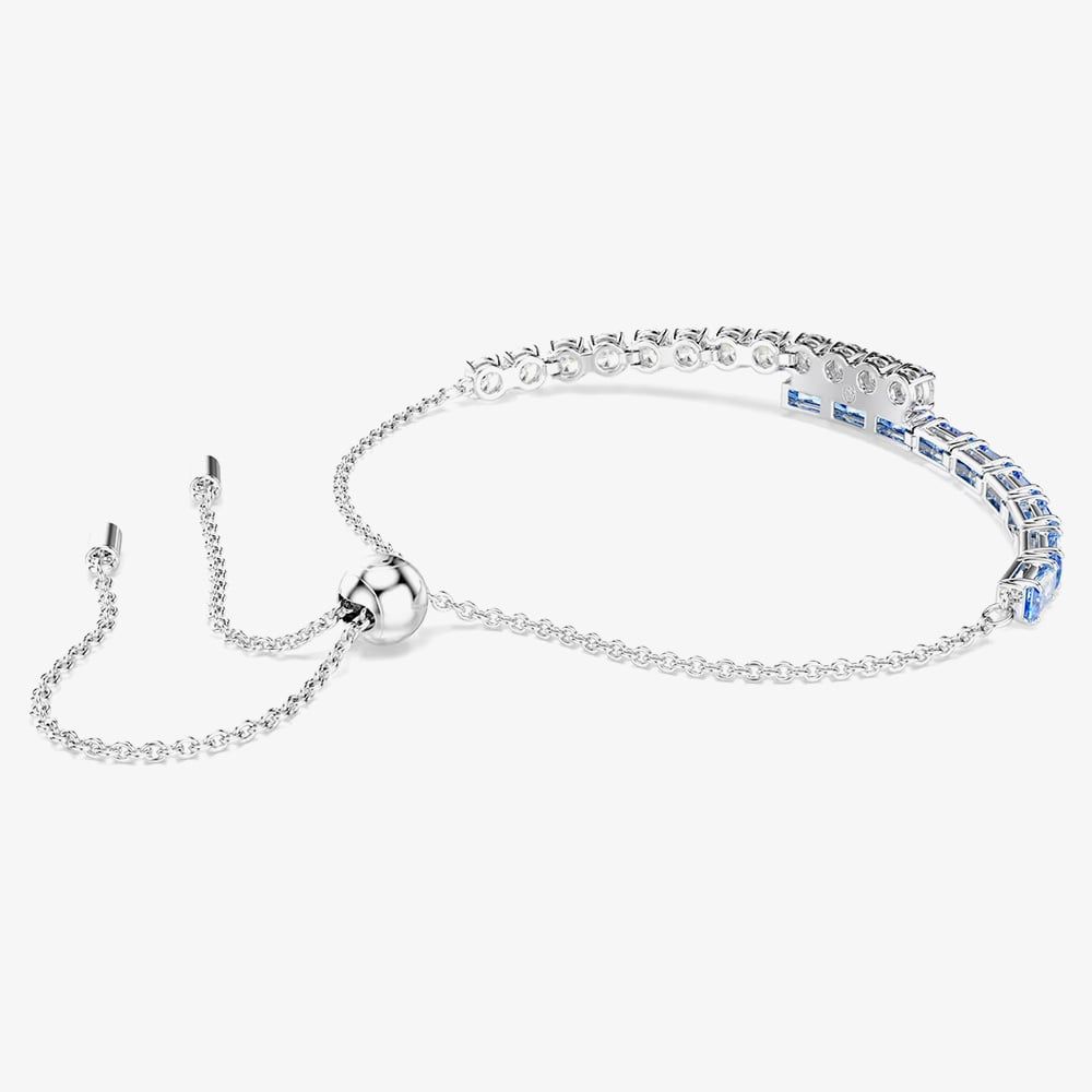 Delicate yet full of energy, this Matrix bracelet adds a joyful spark to your look. Crafted in rhodium plating, it features clear and blue Swarovski Zirconia in a dynamic mix of round and baguette cuts. The adjustable sliding closure ensures a perfect, comfortable fit, making it a vibrant addition to any outfit.