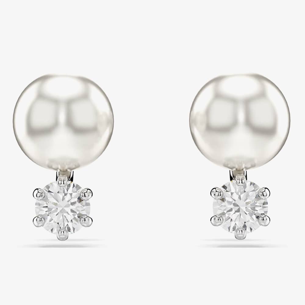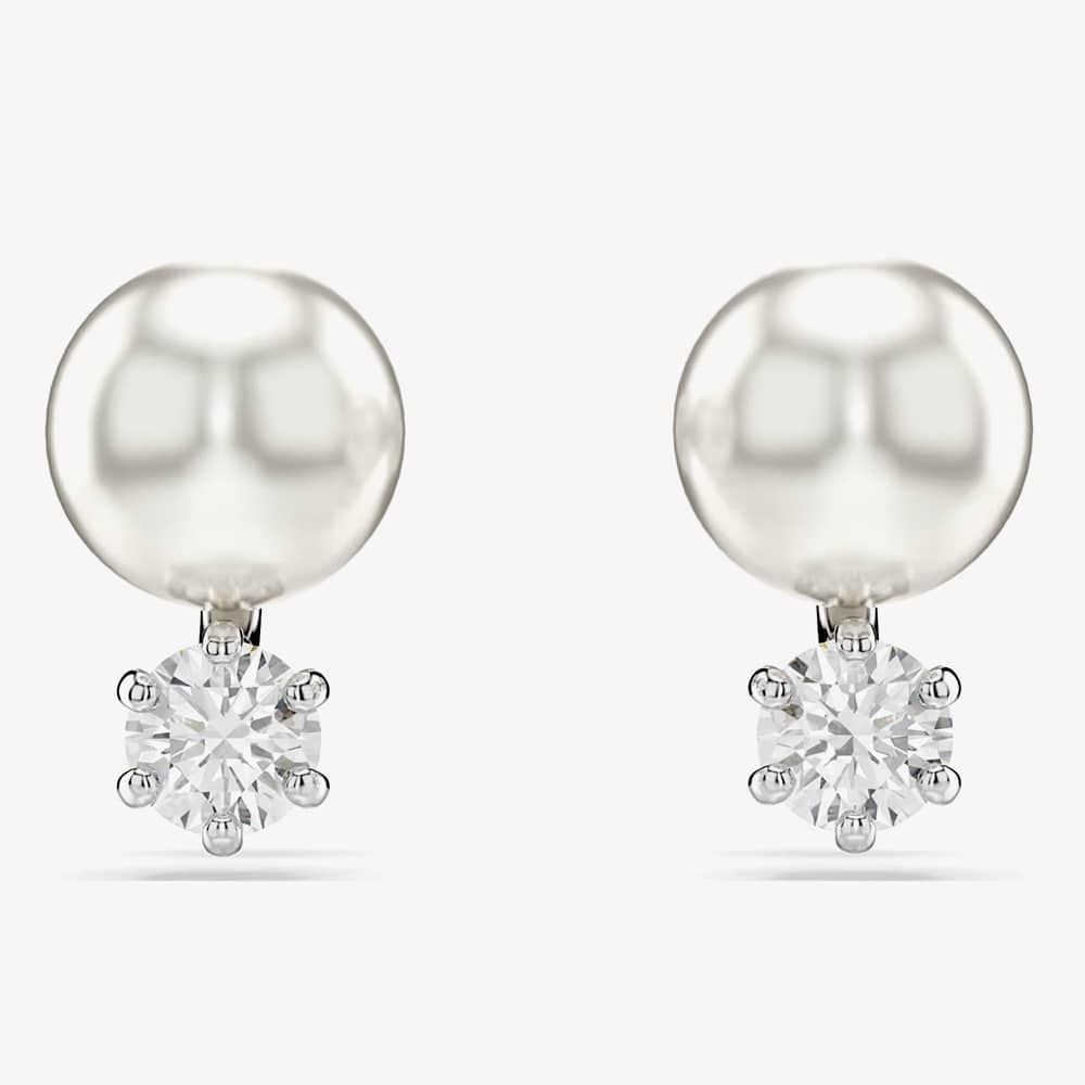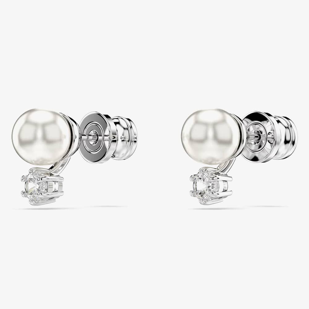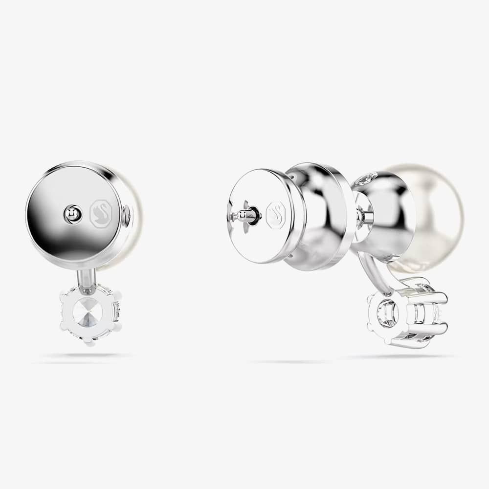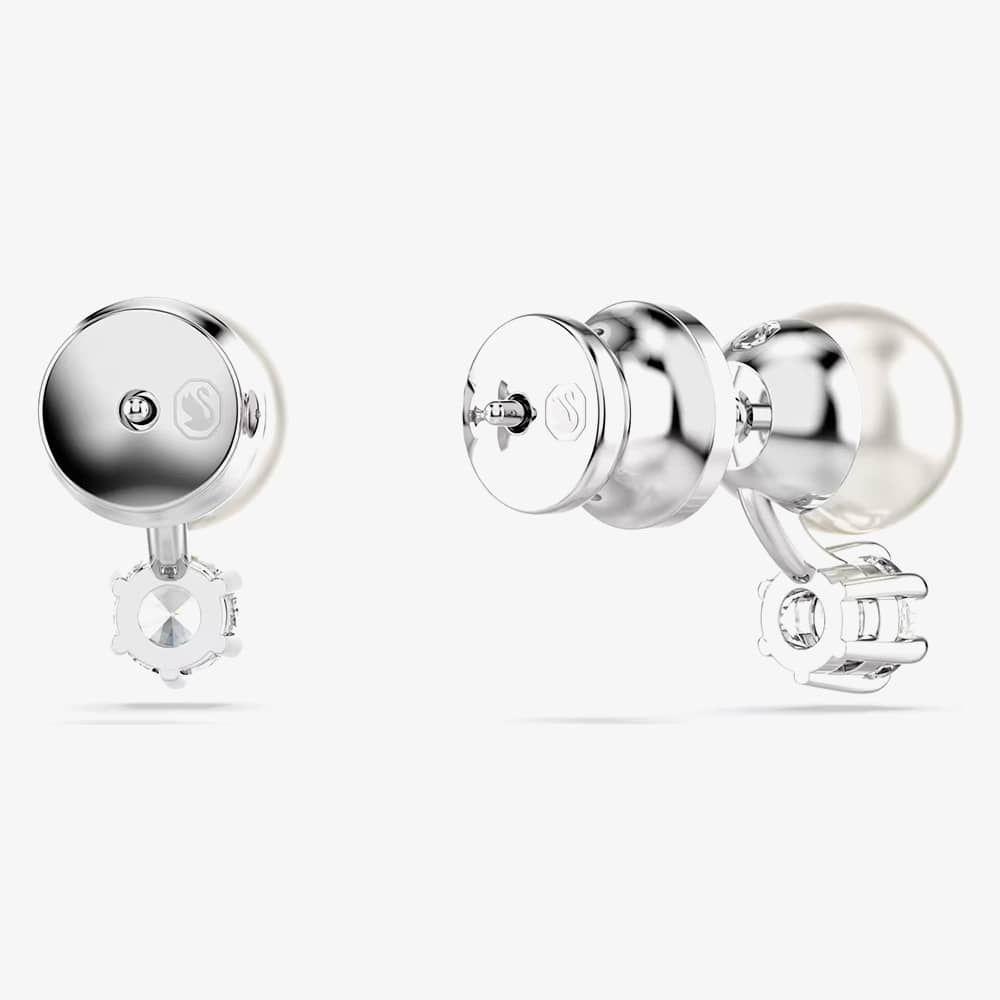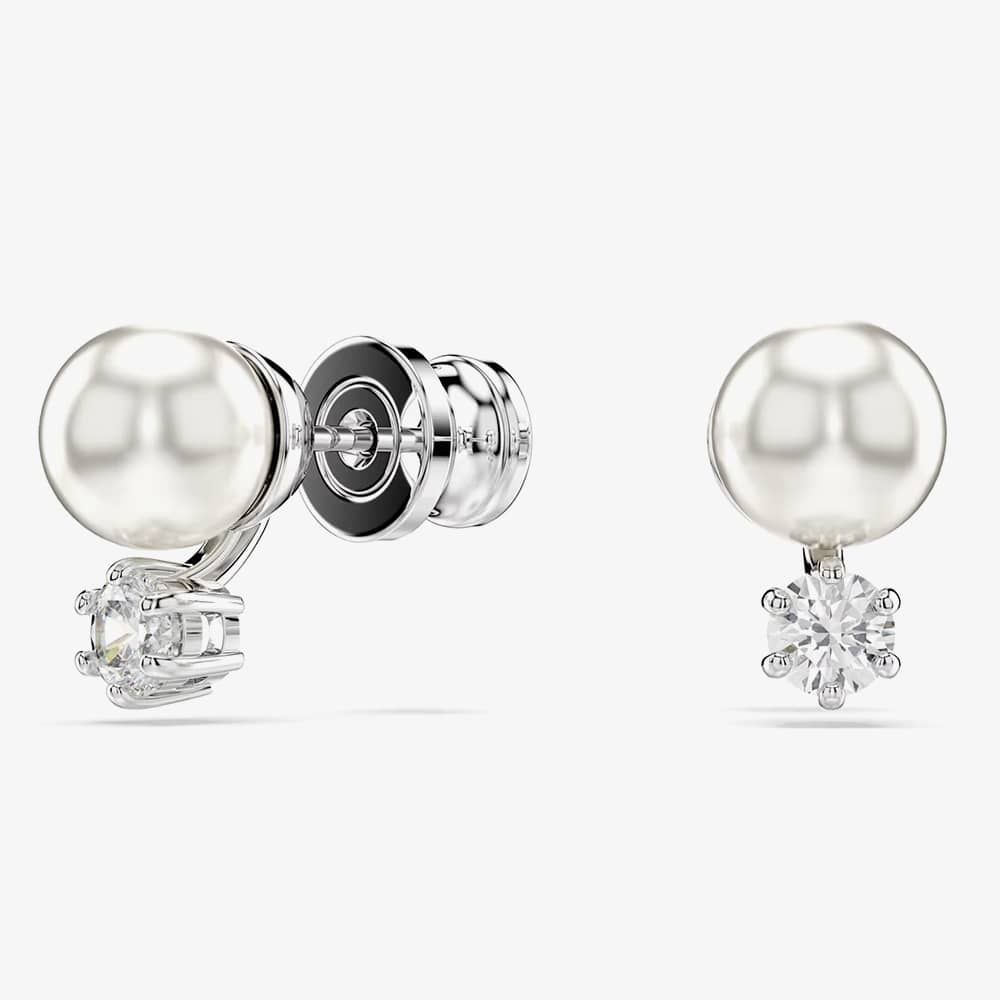 These stunning pierced studs offer a modern twist on the classic pearl earring. Each rhodium-plated piece features a single white Swarovski Crystal Pearl and a round-cut Swarovski Zirconia, elegantly linked to create a light-filled display of luxury.