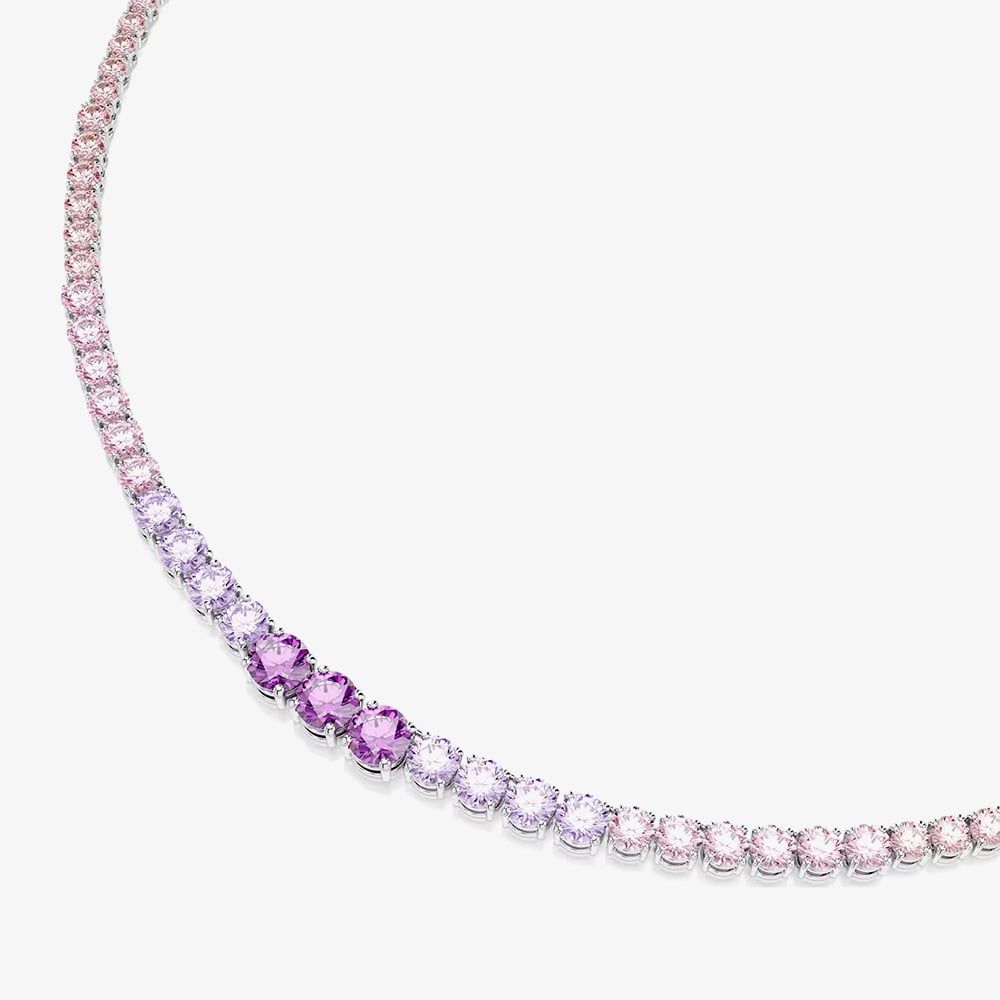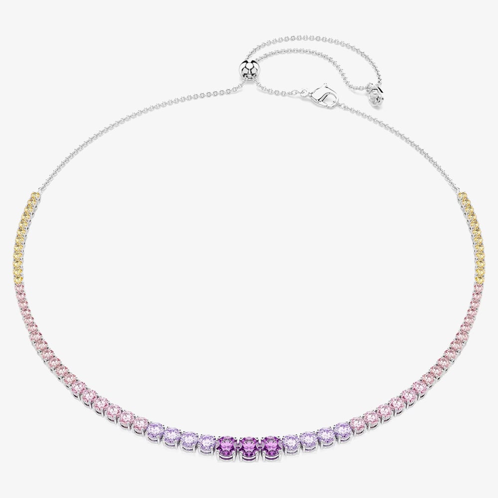 Add vibrant elegance to your jewellery collection with this Swarovski Matrix rhodium-plated multicolour crystal sliding necklace, featuring graduating round crystals in a beautiful purple-to-pink-to-yellow colourway. Finished with a lobster clasp and adjustable sliding ball for a perfect fit from 23–48cm, it’s a refined statement piece ideal for day-to-night sparkle and special occasions.