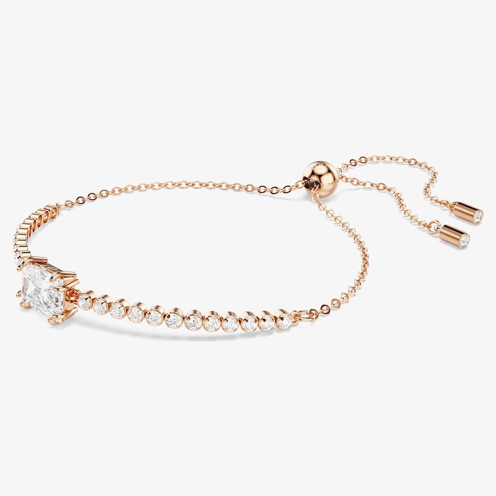 Add a touch of elegance with this rose gold-tone plated tennis bracelet, designed with an adjustable sliding clasp for a comfortable fit. It features a uniform row of sparkling Swarovski Zirconia, beautifully accented by a baguette-cut white Swarovski Zirconia at the centre. A timeless piece with a modern, graceful finish.