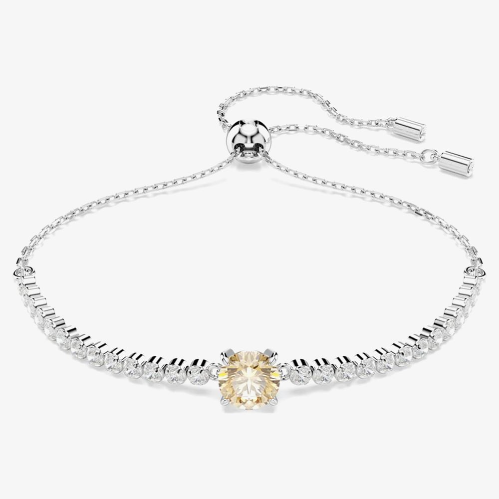 A modern twist on the classic tennis bracelet, this Matrix piece blends clear Swarovski Zirconia with a radiant splash of colour. Secured with a sliding closure, the rhodium-plated jewellery showcases a uniform row of clear Swarovski Zirconia, highlighted by a round-cut champagne Swarovski Zirconia at the centre. This joyfully radiant piece will elevate any outfit.
