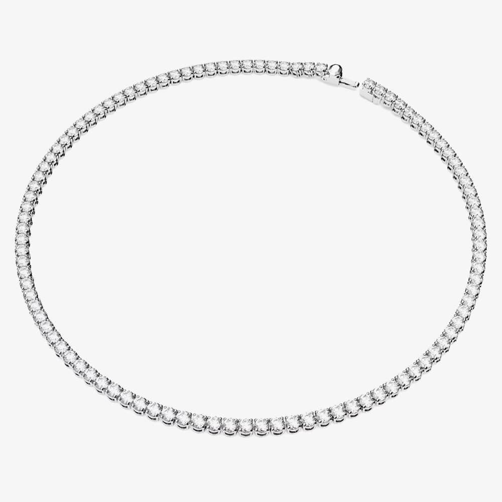 The Swarovski Tennis Necklace is delicately crafted from base metal with silver rhodium plating. This beautiful tennis necklace is adorned with white brilliant-cut cubic zirconia stones set in a four-claw setting and is a size medium. Necklace length: 41cm. Width: 0.4cm.