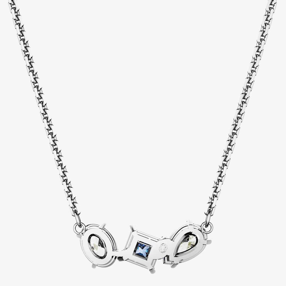 Experience exquisite refinement with the elegant Mesmera necklace, a bold blend of cuts and colour. Its rhodium-plated design delicately hangs on a chain and showcases a trio of prong-set Swarovski Zirconia stones in varying shapes, with a radiant blue central stone. A wondrous gift that accentuates any style.