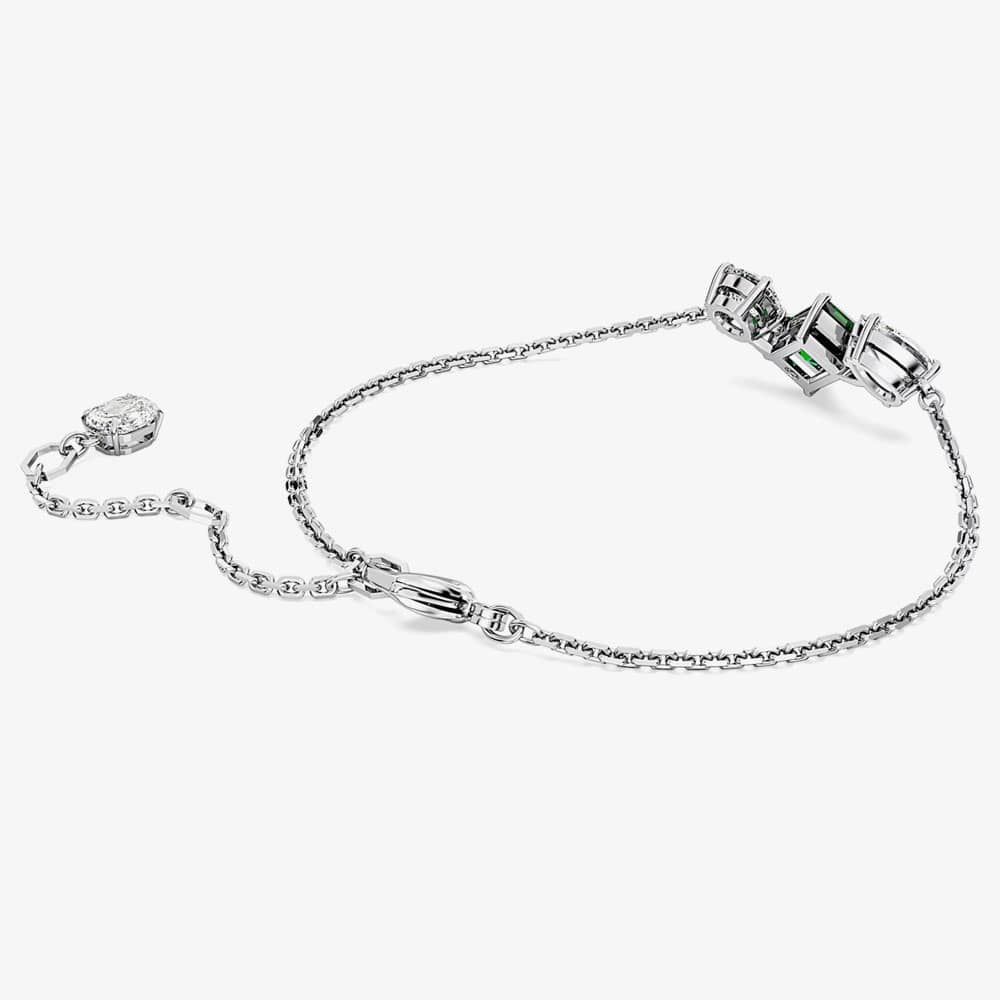 Ready to impress, the Mesmera bracelet accentuates with a vibrant flourish of colour. The rhodium-plated design gracefully hangs on a delicate chain and showcases a trio of prong-set Swarovski Zirconia stones in varying shapes, with a central green octagon-step stone. A bold mix of cuts that makes it a wondrous gift.