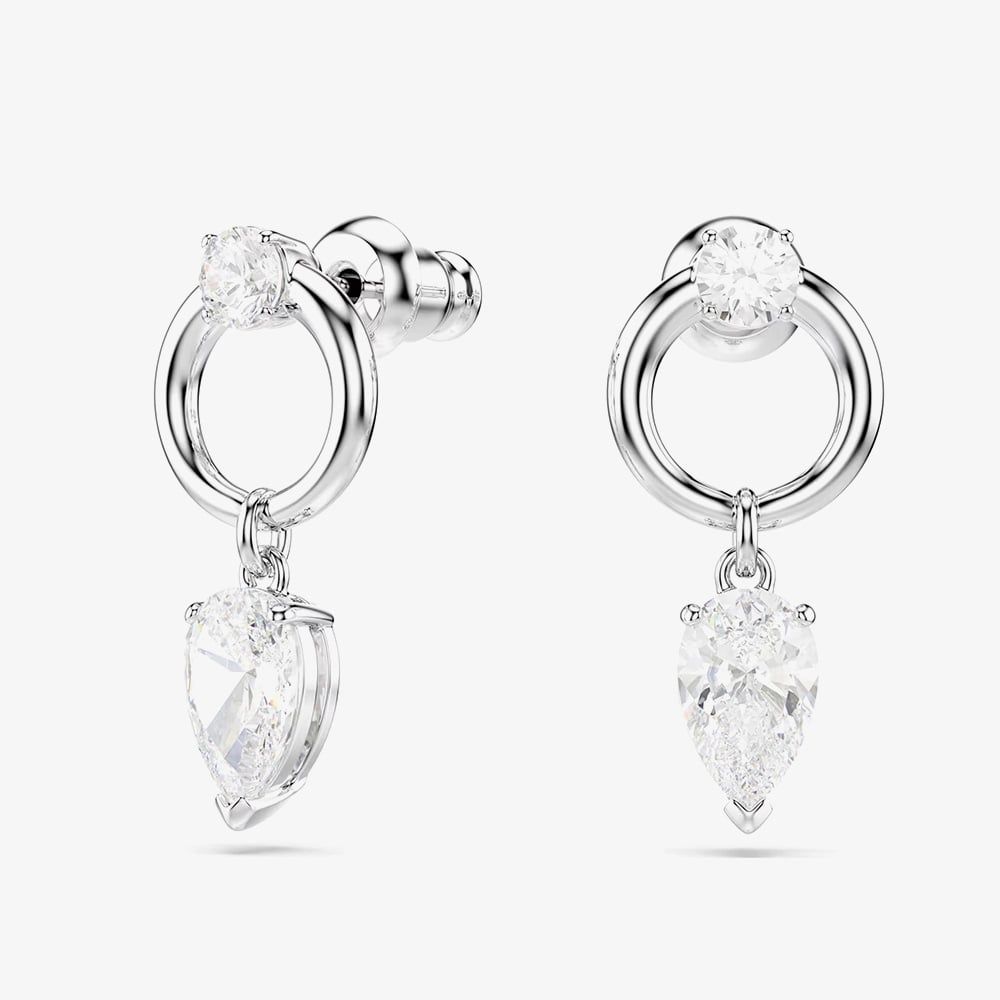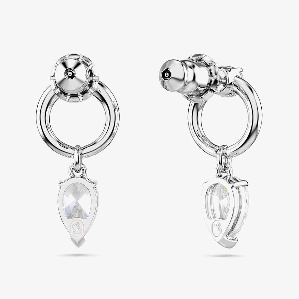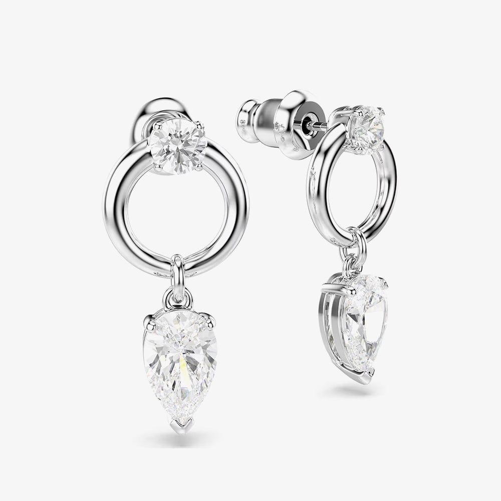 These stunning Mesmera earrings capture light beautifully from every angle. Each piece showcases a pear-cut Swarovski Zirconia suspended from a sleek rhodium-plated hoop, accented by a sparkling round-cut Swarovski Zirconia at the centre for added brilliance.