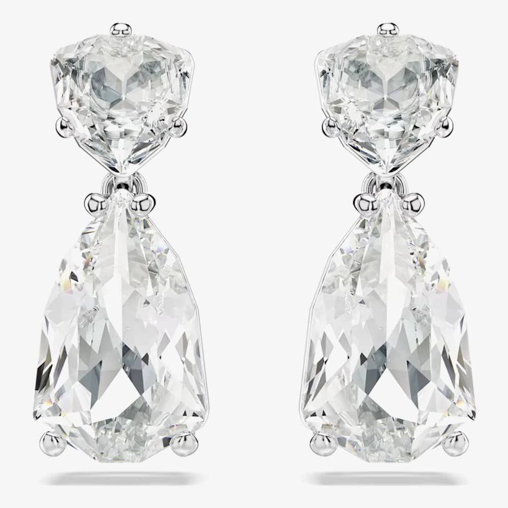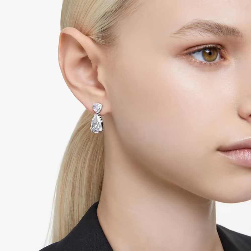 These earrings are adorned with a harmonious arrangement of white Swarovski crystals in mesmerising mixed cuts, redefine sophistication for daily wear. The rhodium-plated setting infuses them with an everlasting allure, ensuring they effortlessly complement any outfit.