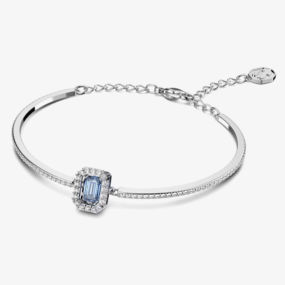 Featuring a vibrant blue, octagon-cut stone surrounded by delicate crystals, it is set on a sleek rhodium-plated band with a secure lobster clasp fastening. Versatile and chic, this bangle is the perfect choice for elevating everyday denim or adding a touch of sophistication to sleek office tailoring.