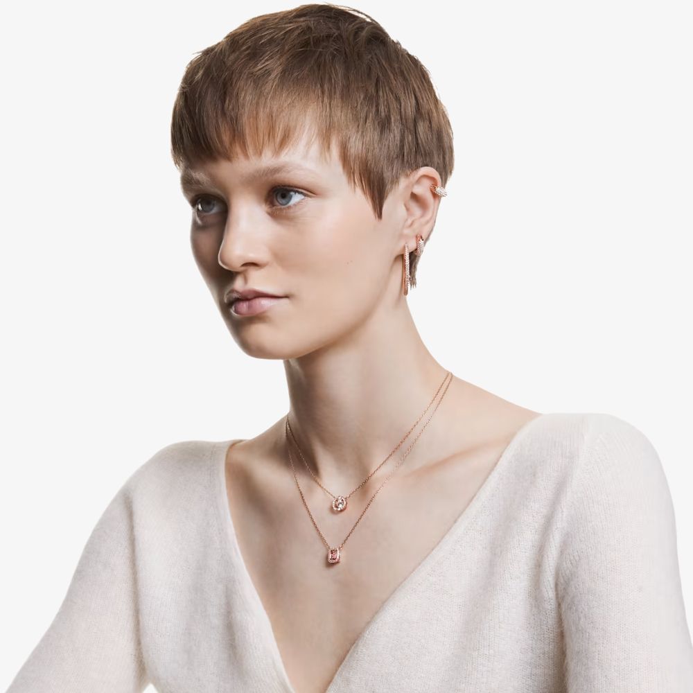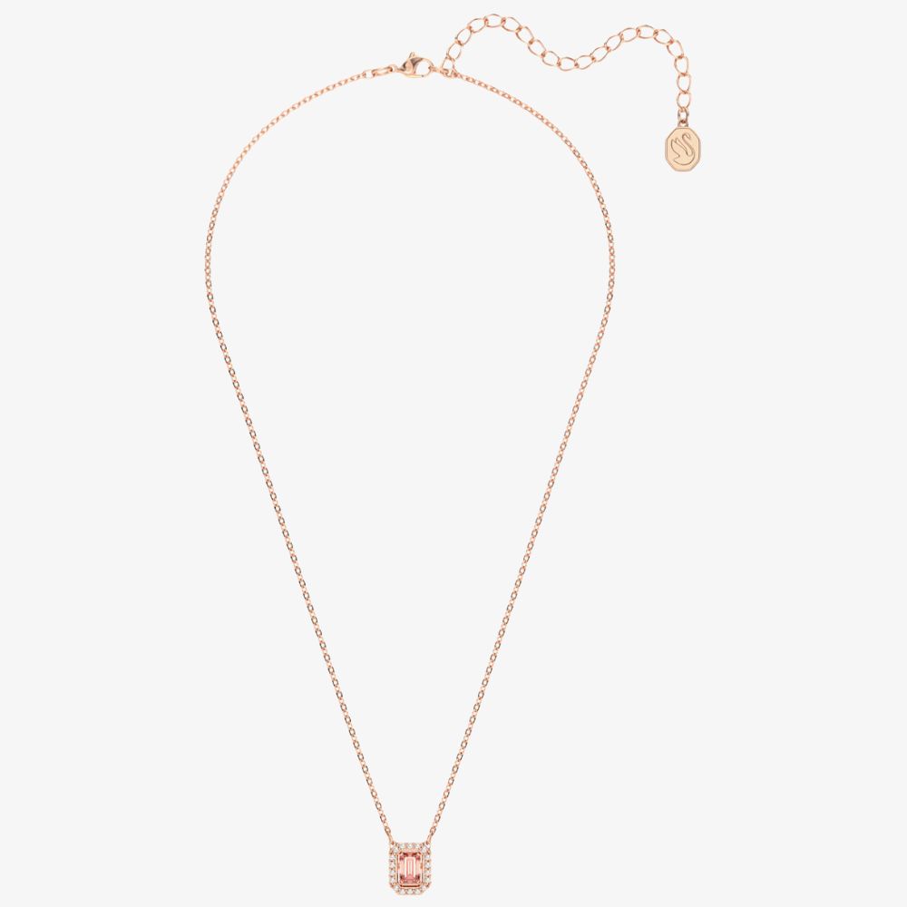 Serving as a focal point for any ensemble, its octagon-cut pink stone is surrounded by smaller crystals and hangs gracefully from a dainty chain plated in rose gold tone. Whether enhancing a casual or formal outfit, wearing this pendant imparts a feminine touch to your look.
