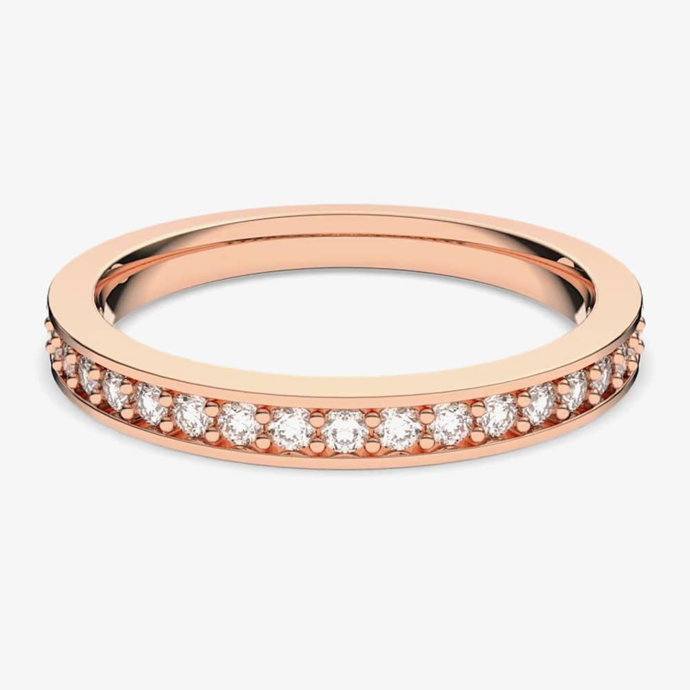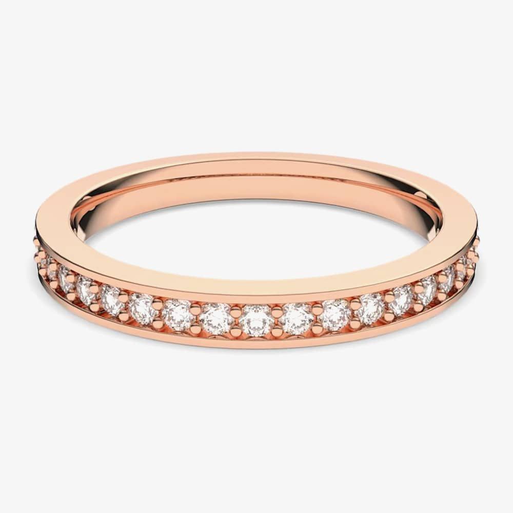 This rose gold-tone plated ring features a sleek design and a half-circle arrangement of meticulously cut stones, providing an elegant and effortlessly wearable piece.