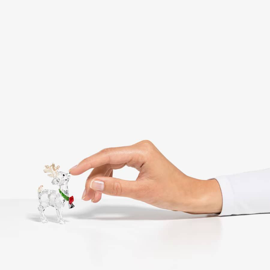 In a Swarovski tribute to Santa's friends, this enchanting figurine is inspired by the sparkling memories of reindeers. With 466 dazzling crystal facets, this little fellow stand poised for festive duties. The crystal antlers and a vibrant green and red bow beautifully contrast with his clear crystal body, while his eager expression is charmingly brought to life by his black eyes and nose.
