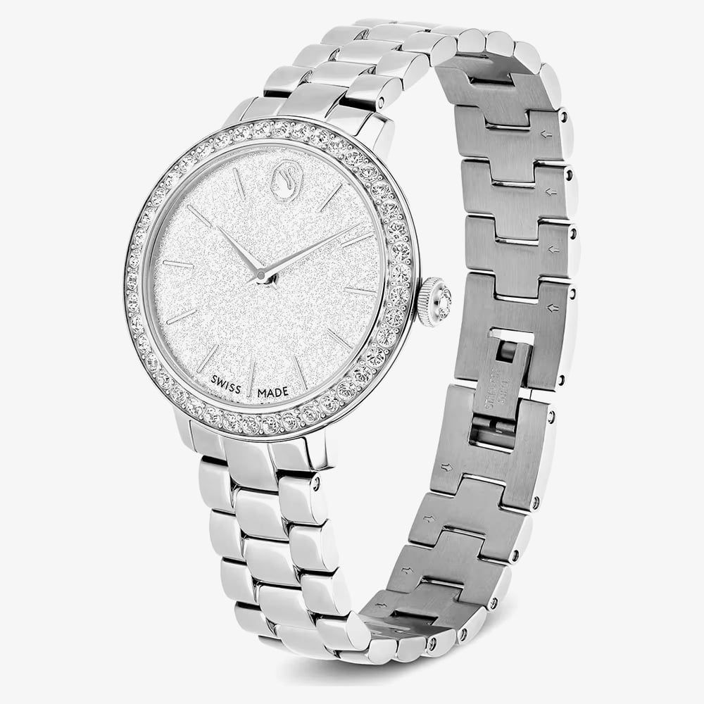 Inspired by Swarovski’s Matrix jewellery, this 30 mm timepiece blends contemporary style with elegant details. Crafted from stainless steel, it features a pave bezel adorned with 42 crystals and a glittering round dial with slender hour markers, hands, and the signature swan logo at 12 o’clock. A crystal set in the crown adds extra sparkle, while the smooth three-link bracelet ensures comfortable wear. Swiss Made and water resistant to 50 m, this watch is the perfect accessory for any occasion.