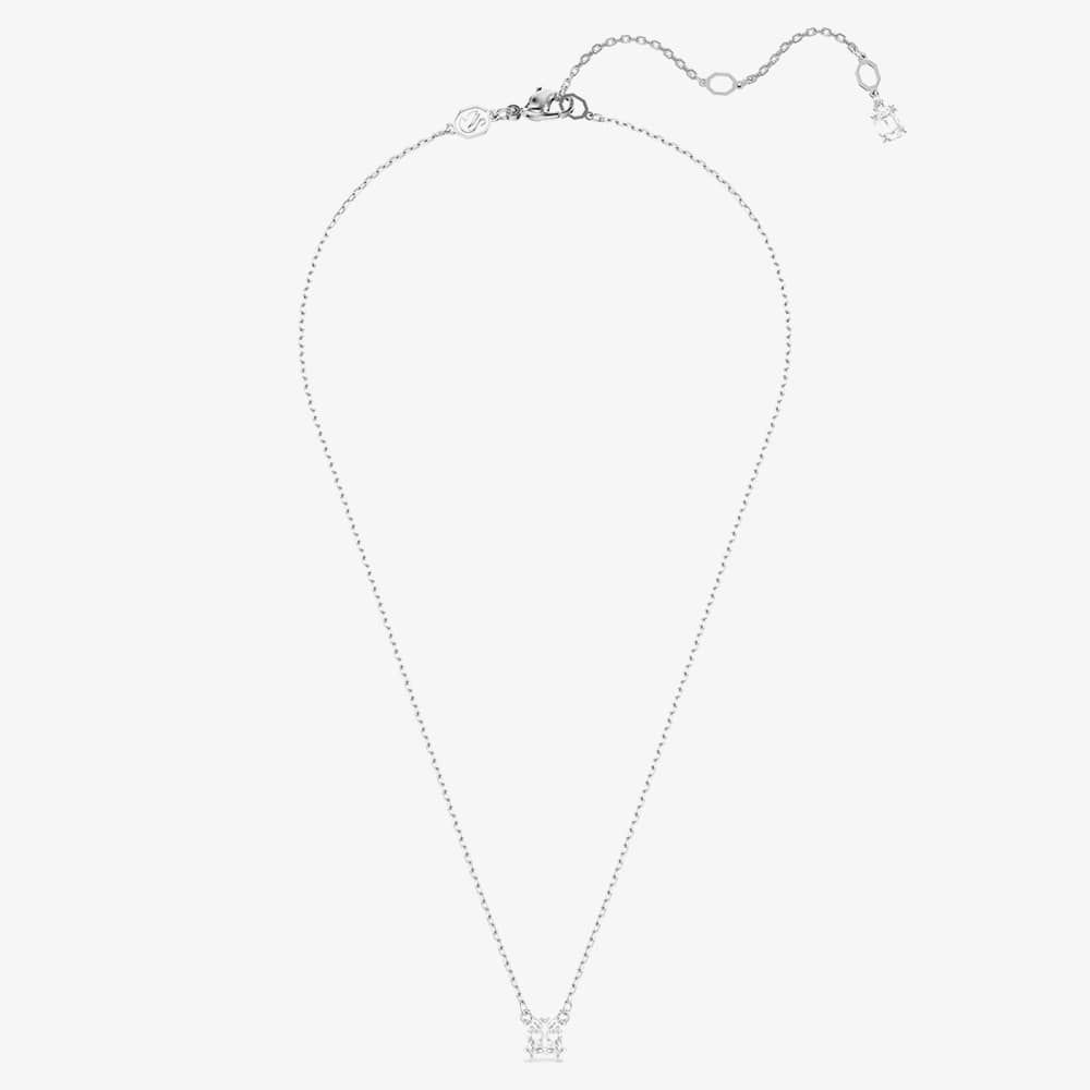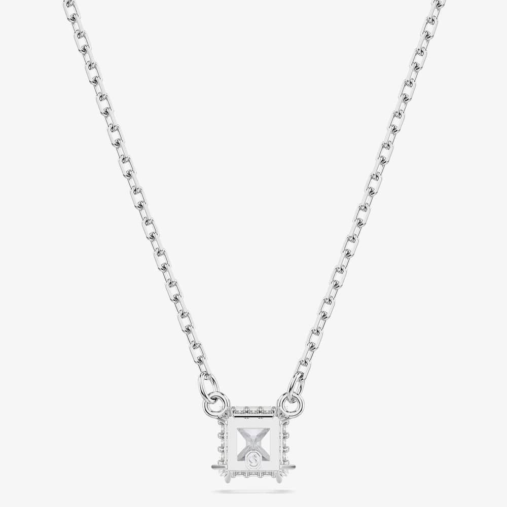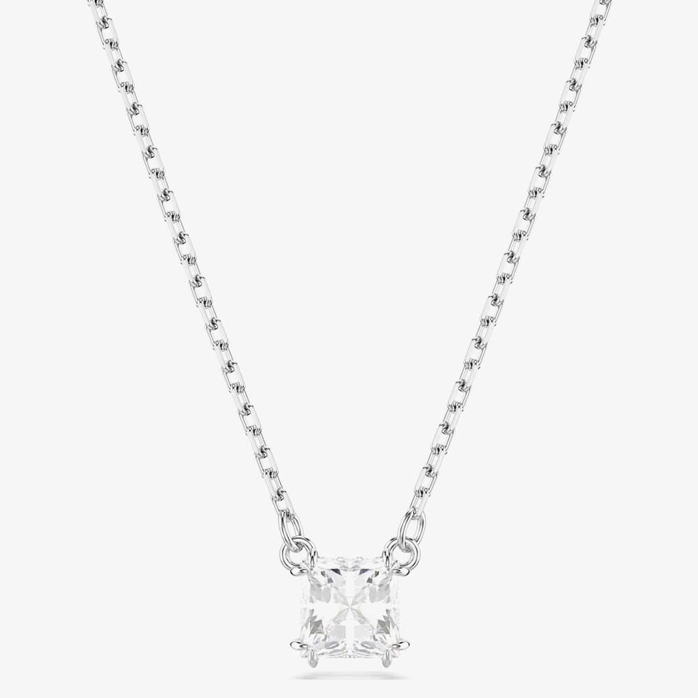 The rhodium plated design features a square-cut Swarovski Zirconia in an elegant double prong setting, while the elongated chain is finished with a lobster closure. This versatile piece would make a captivating gift for someone special.