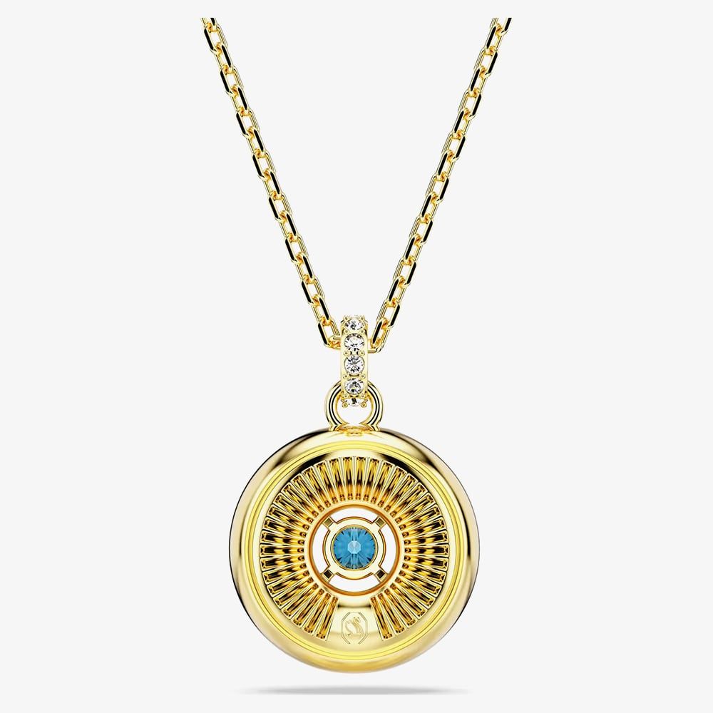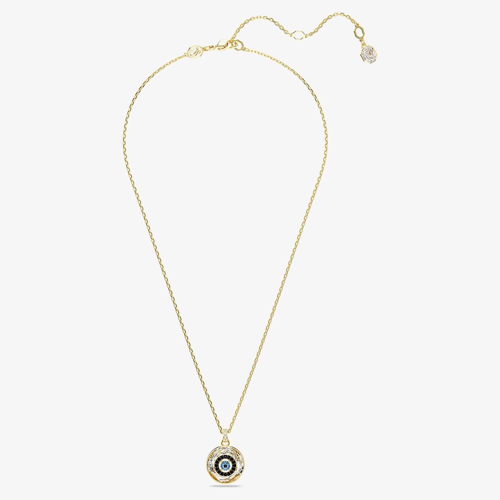 Embrace positivity with the Symbolica pendant. This gold-tone plated jewellery highlights Swarovski's craftsmanship, featuring an evil eye motif made from a faceted outer ring, black pavé, and a central blue dancing stone. Hanging from a beaded chain and connected by a small pavé link, this radiant pendant is both meaningful and mesmerizing.
