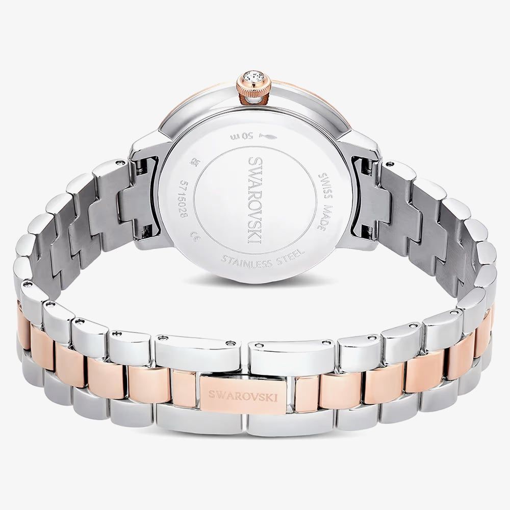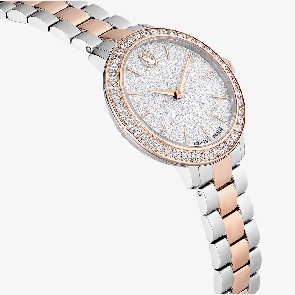 Inspired by Swarovski’s Matrix jewellery, this 30 mm timepiece blends contemporary style with elegant details. Crafted from stainless steel, it features a pave bezel adorned with 42 crystals and a glittering round dial with rose gold hands, hour markers, and the signature swan logo at 12 o’clock. A crystal set in the crown adds extra sparkle, while the two-tone silver and rose gold three-link bracelet strap ensures comfortable, stylish wear.
