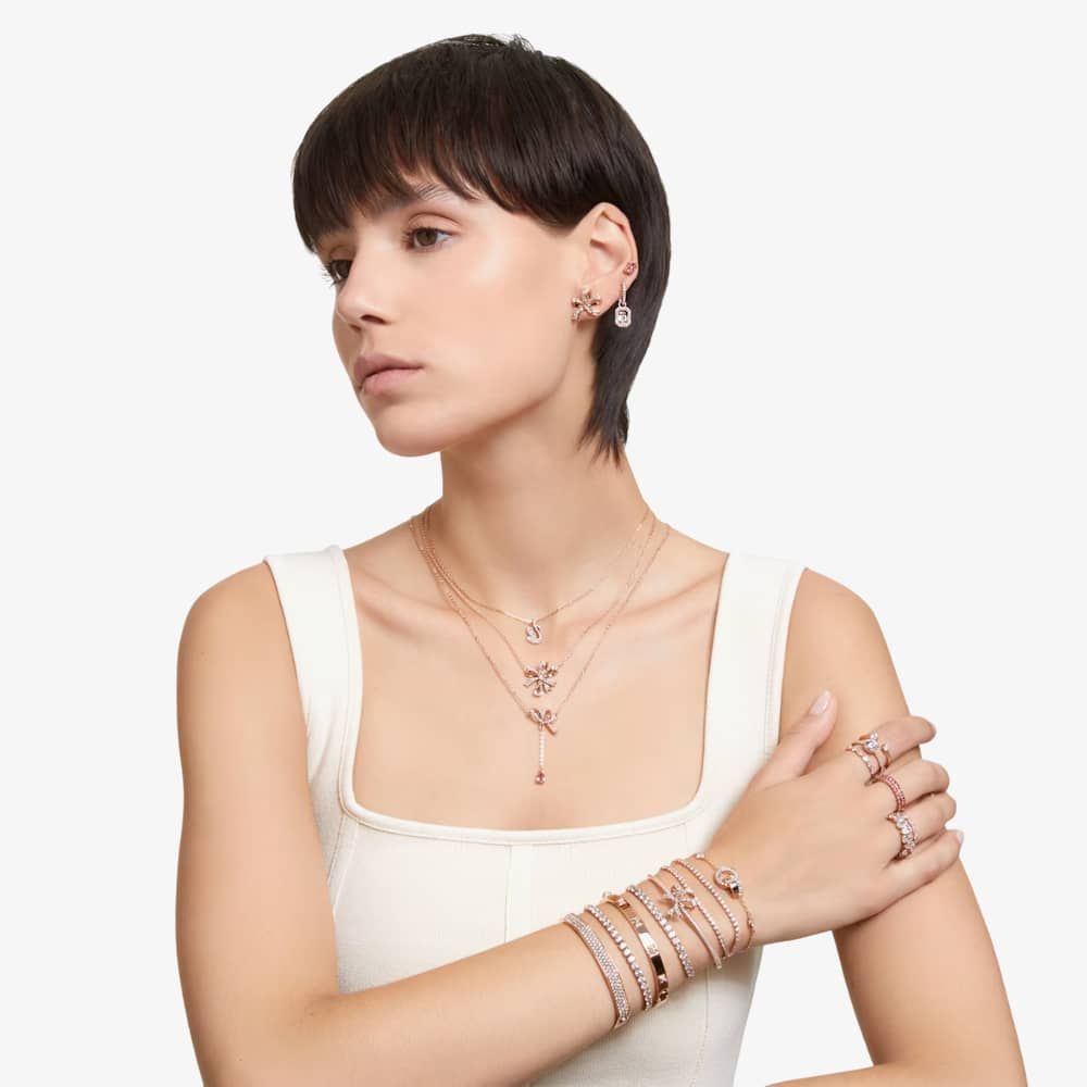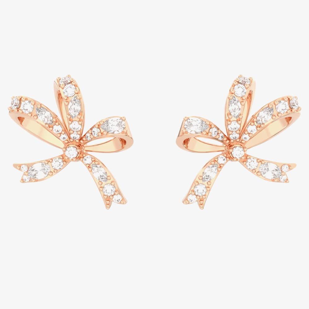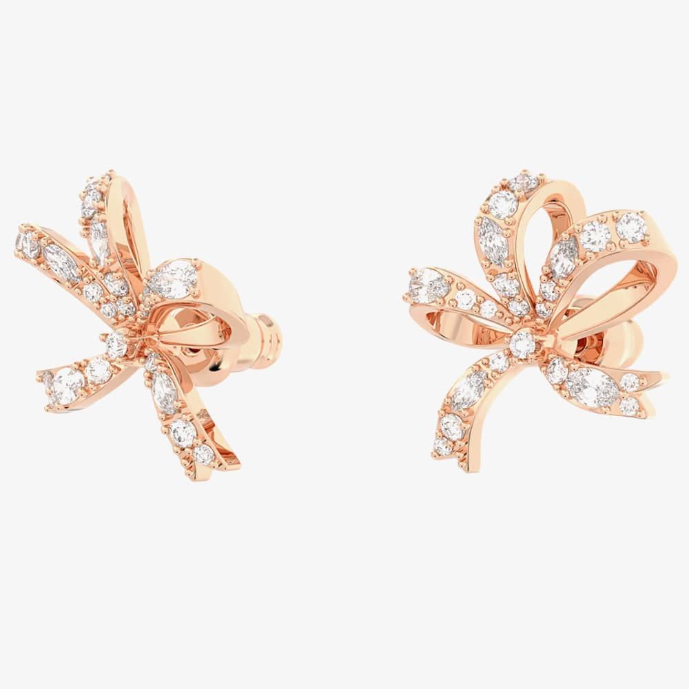 Crafted in rose gold-tone plating, each piece is intricately designed in the form of a ribbon, adorned with a dazzling array of clear crystals meticulously set using the chatonage technique.