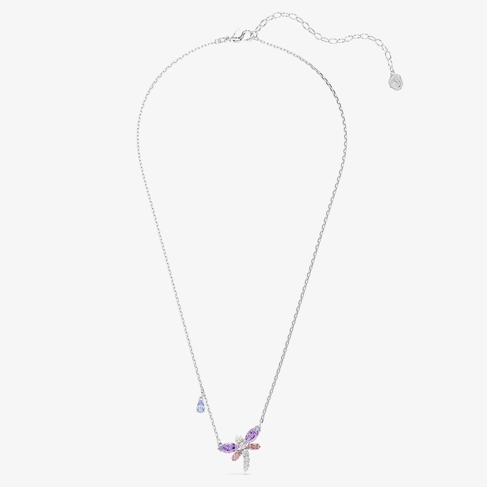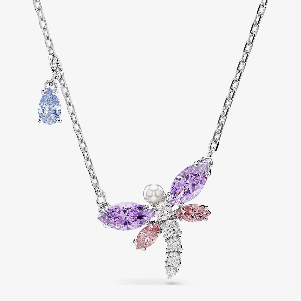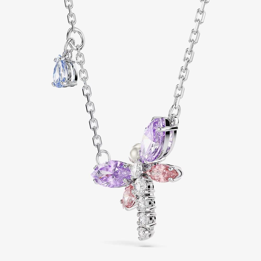 Intricately crafted with a rhodium plated finish, this sweet dragonfly pendant necklace from the Ariana Grande x Swarovski collection is the perfect combination of nature and a colourful introduction into spring. The dragonfly motif is set with Swarovski Crystals in delicate pink and purple hues for subtle sparkle and elegance, a single Swarovski Pearl and white Swarovski Zirconia. Complete with a lobster clasp, this necklace can be worn alone for a statement look or paired with other pieces from the dragonfly collection.