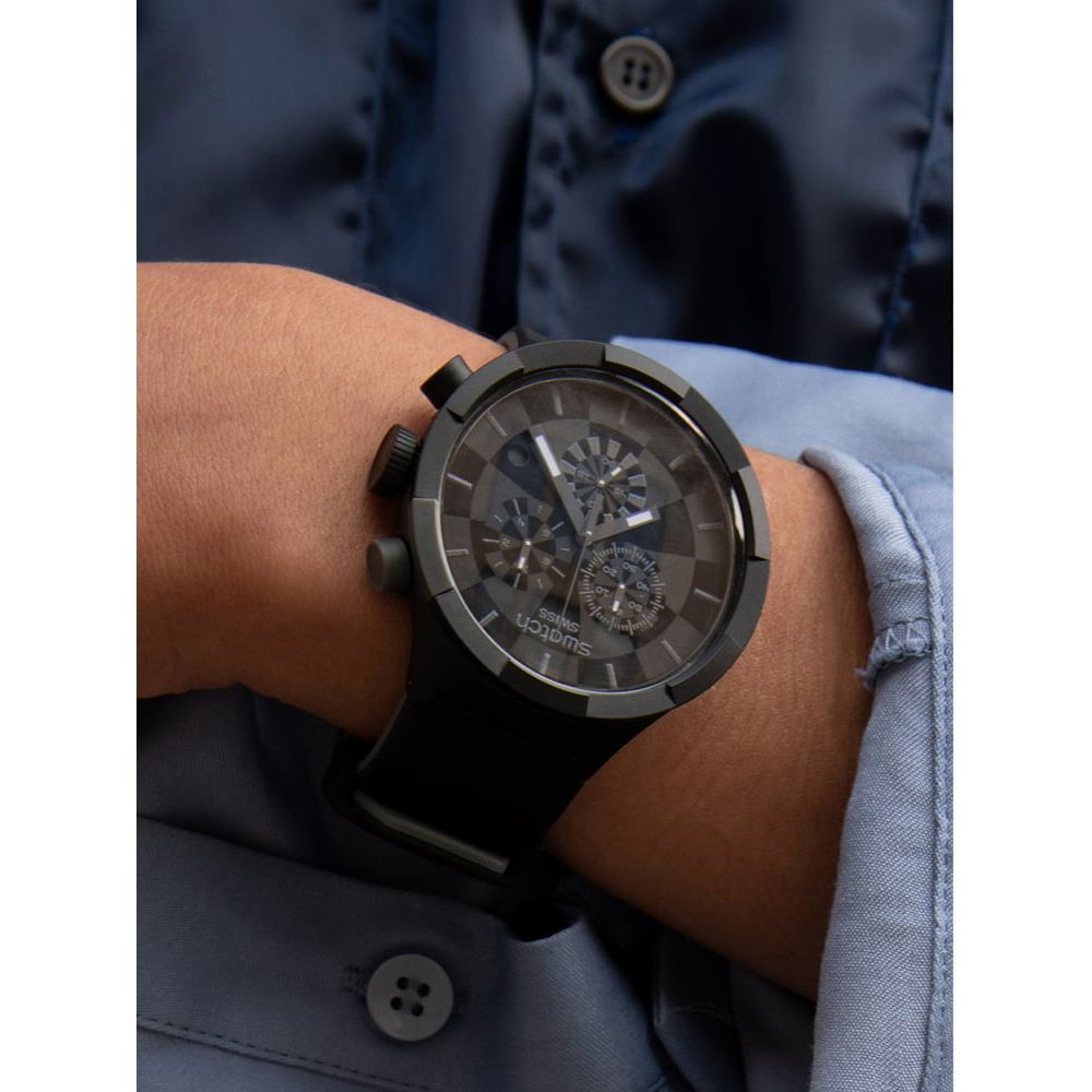 This stylish chronograph display watch from Swatch features a black patterned dial with a date window at four o'clock. It is completed with a black rubber strap and a buckle fastening.