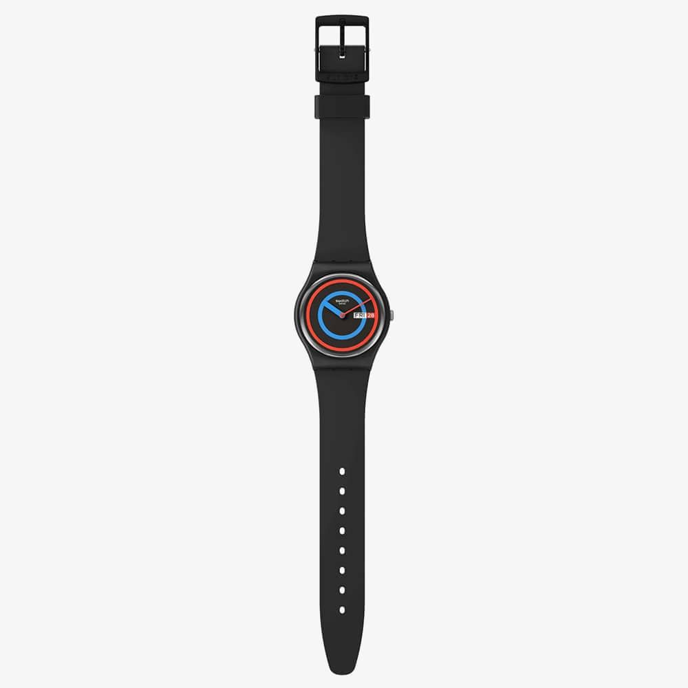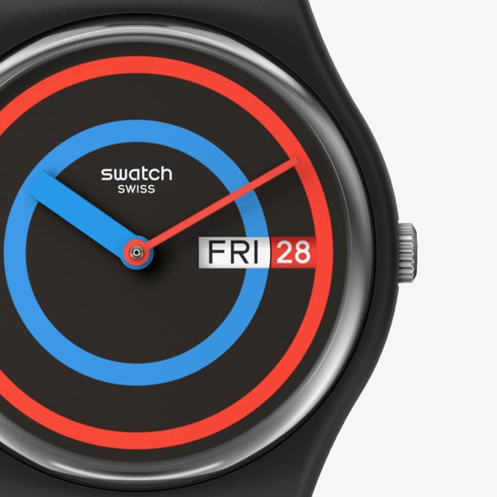 The Swatch SO28B706 watch combines a 34mm round shaped plastic case and black rubber strap with a traditional buckle. It has a black analogue dial which is protected beneath plastic. Power is generated by the quartz movement. This model also has a water resistance of up to 30 metres.