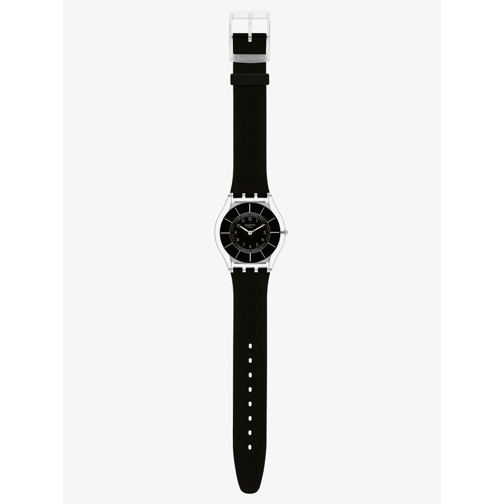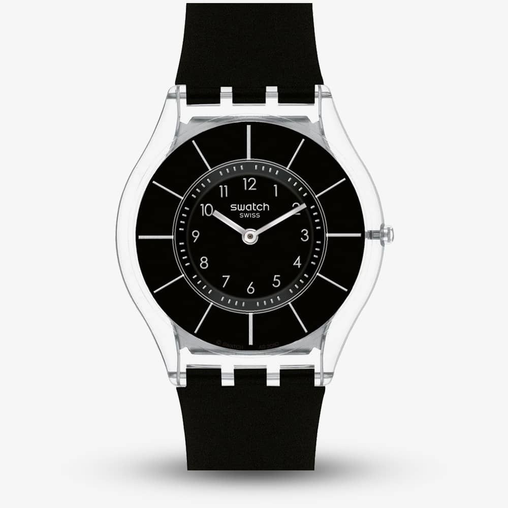 The Swatch SS08K103 Core watch combines a 34mm round shaped plastic see through case and black plastic strap with a traditional buckle. It has a black analogue dial which is protected beneath plastic. Power is generated by the quartz movement. This model also has a water resistance of up to 30 metres. the watch strap and face materials are made from recycled materials and are bio degradable.