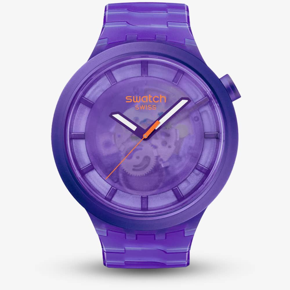 This oversized purple watch features a fully transparent design, extending from its bio sourced case, dial, and bezel to its bio sourced bracelet with a butterfly buckle. The transparent purple biosourced dial reveals the inner workings of the movement, while purple hour and minute hands with glow-in-the-dark capabilities, complemented by a contrasting orange seconds hand, display the time beneath the bio sourced glass.
