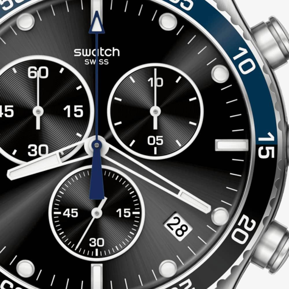 Introducing the dark blue irony from Swatch. This watch is a great addition to the Swatch line up. Featuring three chronograph sub-dials and a black and blue bezel this watch would look good in dress and casual wear.