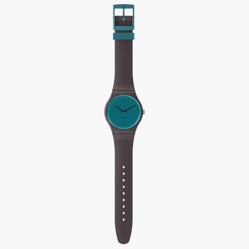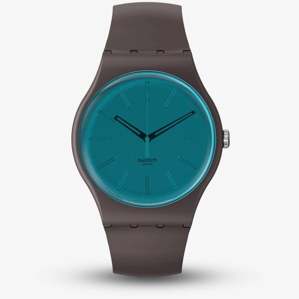 Featuring a polished mirror dial, this brown timepiece showcases black hour and minute hands within a biosourced case, paired with transparent blue biosourced glass. Its unique shimmer comes from a special engraving technique, adding an extra layer of allure to its design.