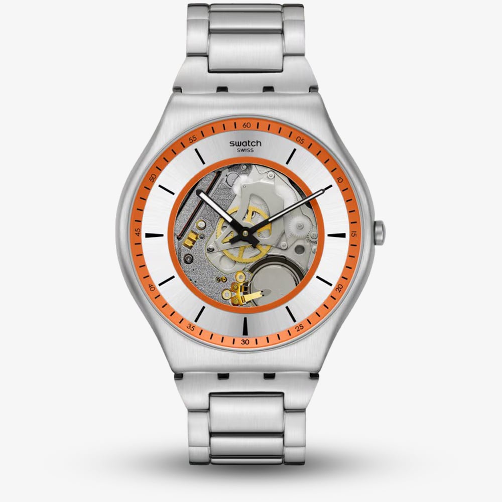 This ultra-slim brushed stainless-steel watch features a Skeleton dial with a sun-brushed finish, accented by black and orange print and an orange ring with black print. Completing its sleek look is a brushed stainless steel adjustable bracelet.