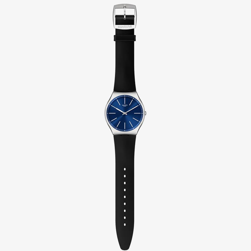 Make a timeless statement with this incredibly slim stainless-steel watch. The sun-brushed blue dial is enhanced by silver-coloured Swatch appliques, elegantly complemented by the polished case. The black leather strap features a stainless-steel buckle for a complete and sophisticated look.