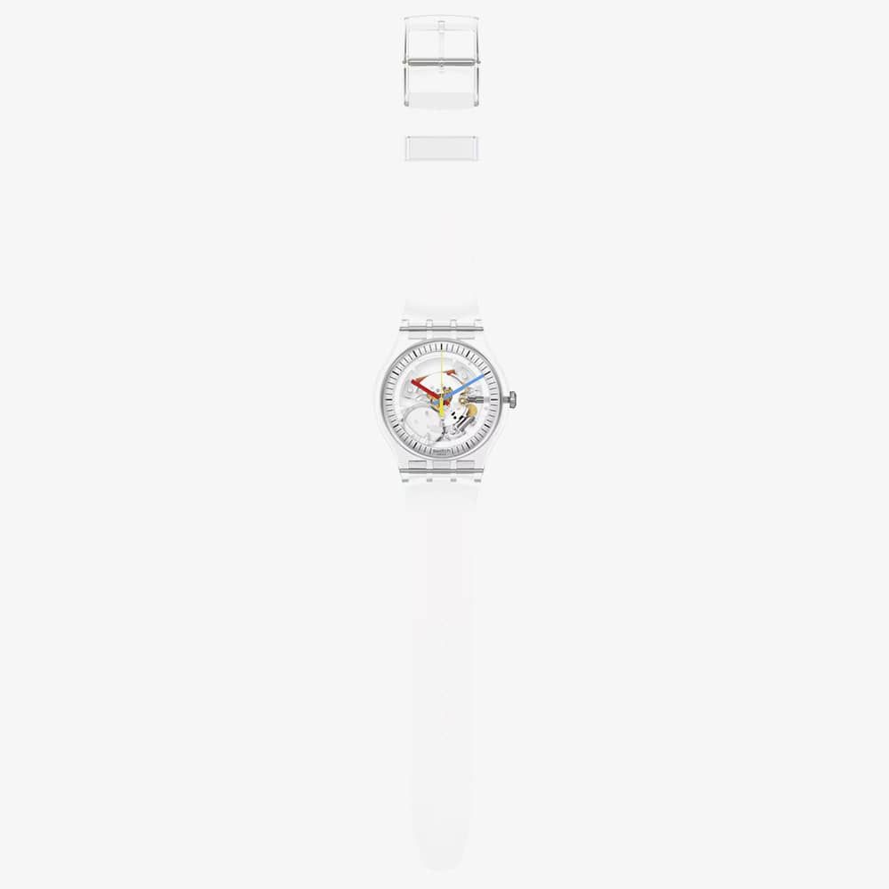 The Swatch Mens Clearly New Gent SO29K100-S06 watch combines a 41mm round shaped plastic case and 0 plastic strap with a traditional buckle. It has a skeleton analogue dial which is protected beneath plastic. Power is generated by the quartz movement. This model also has a water resistance of up to 30 metres.