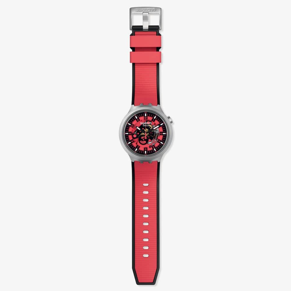 The Swatch Red Juicy Watch has a sleek design and striking grey stainless steel case with an acrylic dial glass and a red rubber strap. Built with Swiss precision, it ensures durability and accuracy complementing your casual or formal event look.