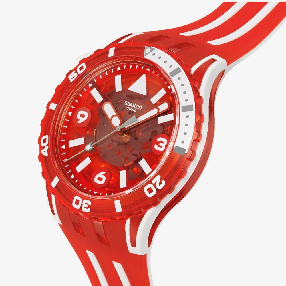 This eye-catching timepiece features a vivid red design that exudes energy and adventure. Built for life above and below the surface, it boasts water resistance up to 100 metres. The luminous hands and markers ensure clear visibility in any lighting, while the durable build and Swiss precision movement deliver reliable performance. Made from unique bio-ceramic material, this watch is a fearless fusion of colour, functionality, and style.
