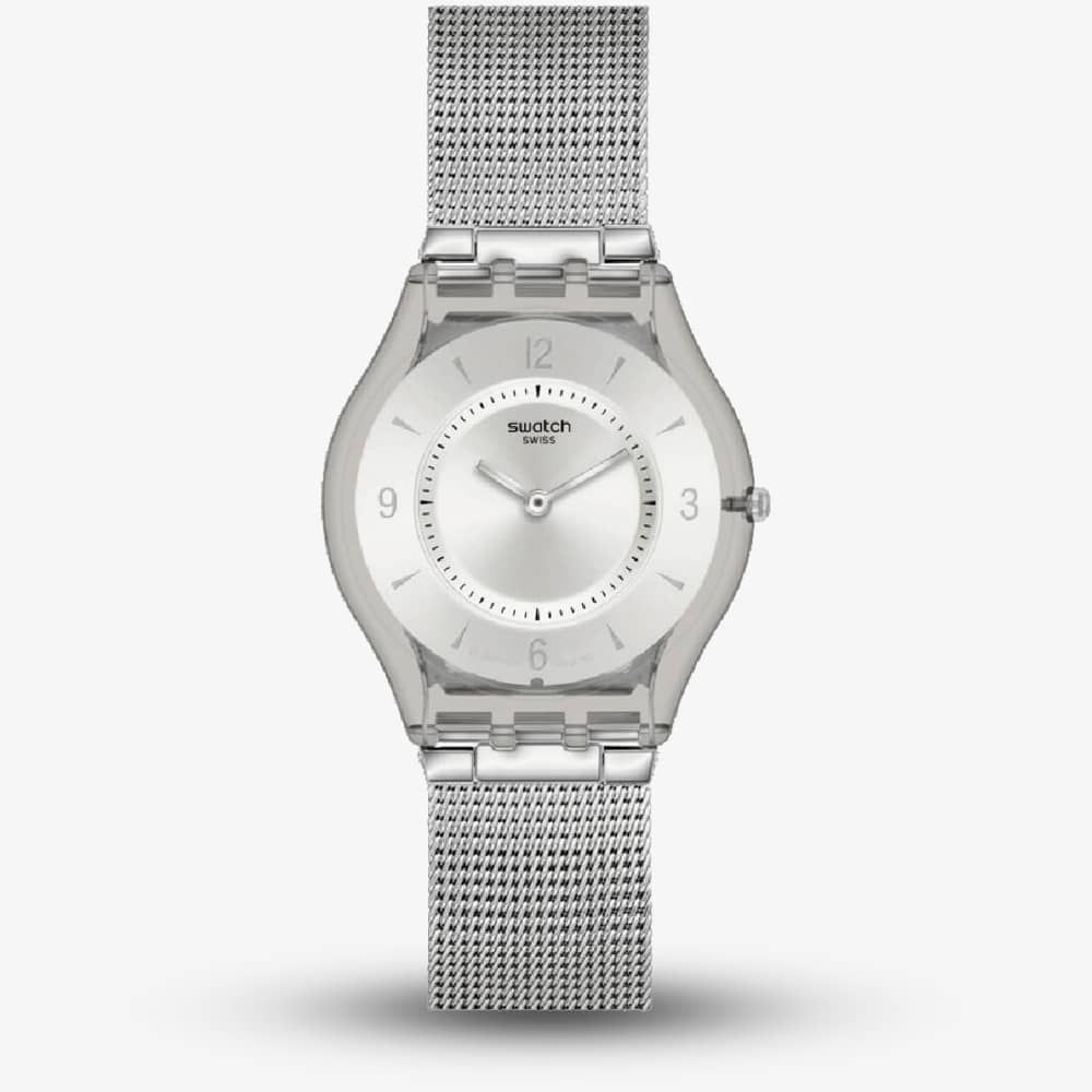 The Swatch Metal Knit Again Watch SS08M100M combines a 34mm round shaped bio-sourced material case and a stainless steel mesh bracelet with a fold over clasp. It has a silver tone analogue dial which is protected beneath plastic. Power is generated by the quartz movement. This model also has a water resistance of up to 30 metres.