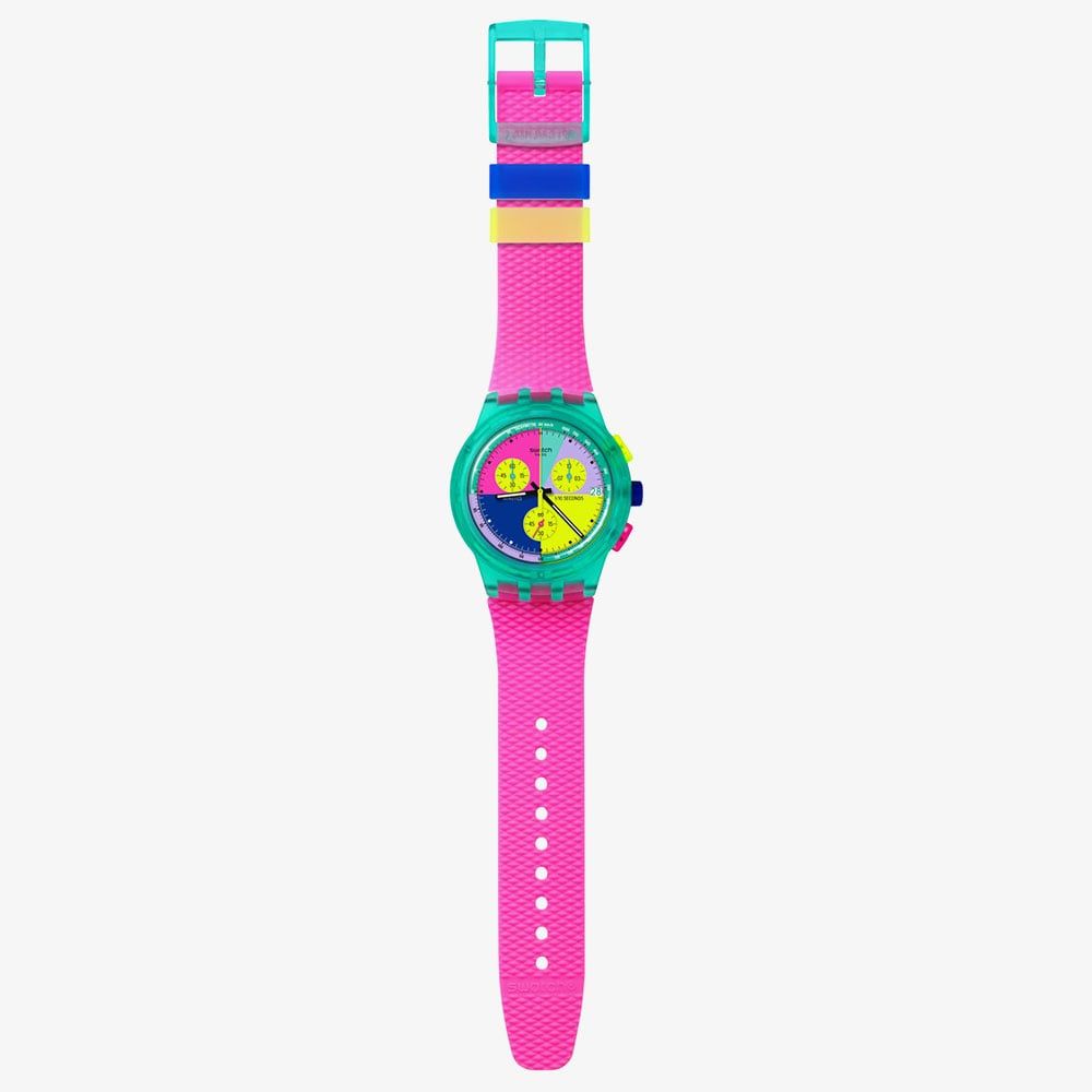 This vibrant chronograph draws inspiration from the iconic 90's Swatch CHRONO: FLASH ARROW. Its multi-coloured dial features a tachymeter scale and glow-in-the-dark black hour and minute hands, complemented by a yellow second’s hand and a day window positioned at 3 o'clock. The timepiece is encased in a transparent matte green case with a matching bezel. Adding to its striking design, the structured pink strap is highlighted by contrasting transparent matte yellow and blue loops, and secured with a transparent matte green buckle.