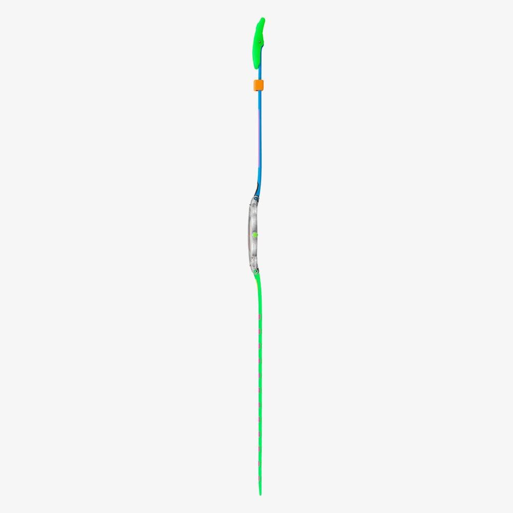 This retro ultra-slim watch draws inspiration from the 80's Swatch collectible: HOT RACER. It features a vibrant, multi-coloured dial with green hour and minute hands, housed in a transparent shiny bio-sourced case with bio-sourced glass. The dial is adorned with dots, batons, and numbers as hour markers. The watch comes with a transparent matte green bottom strap and a blue top strap, both with multi-coloured prints, complemented by an orange loop and a green buckle.
