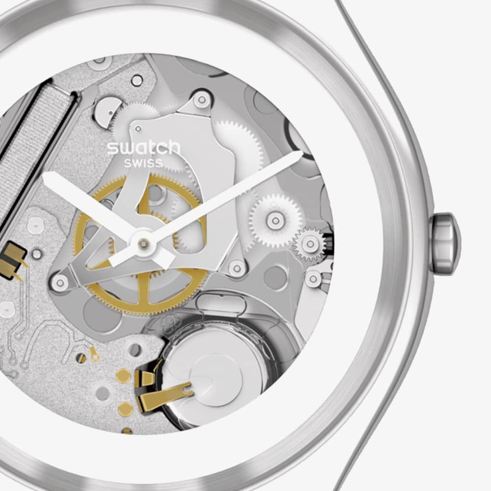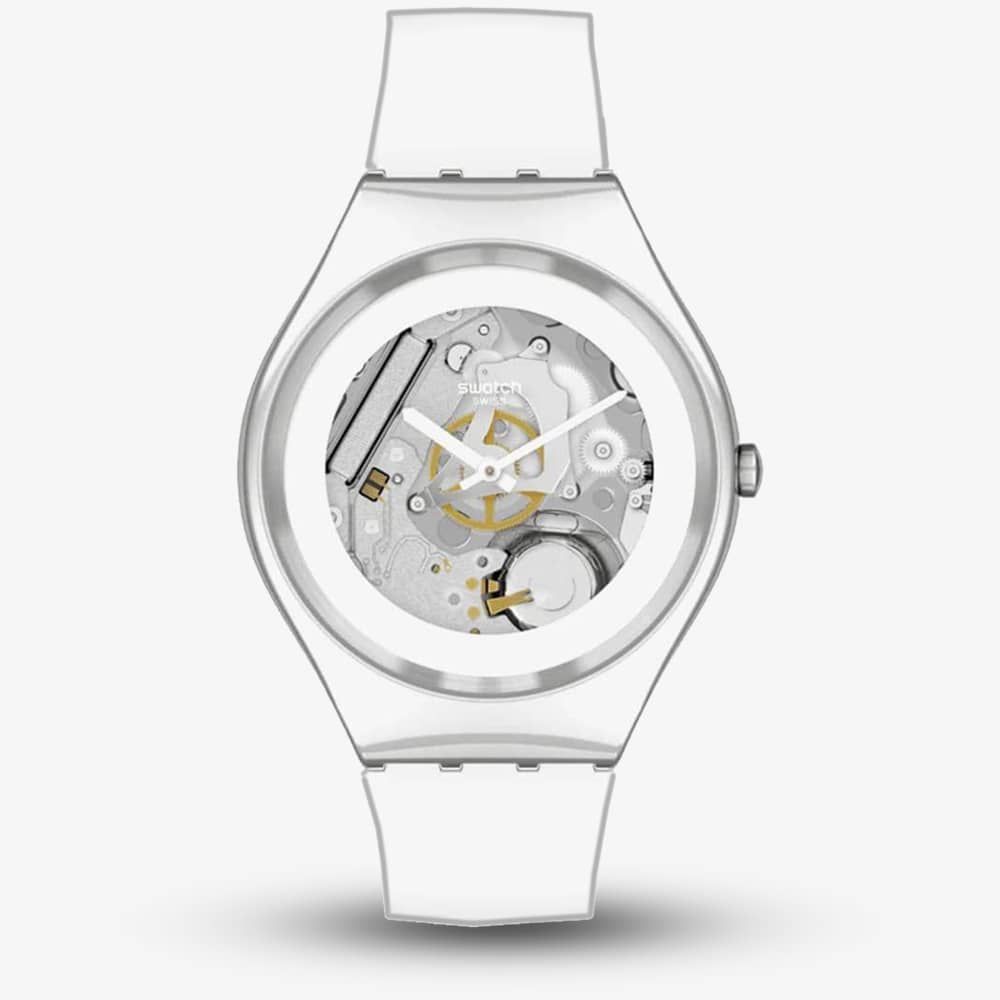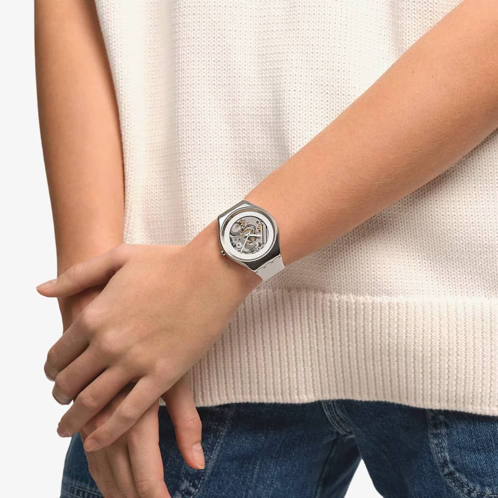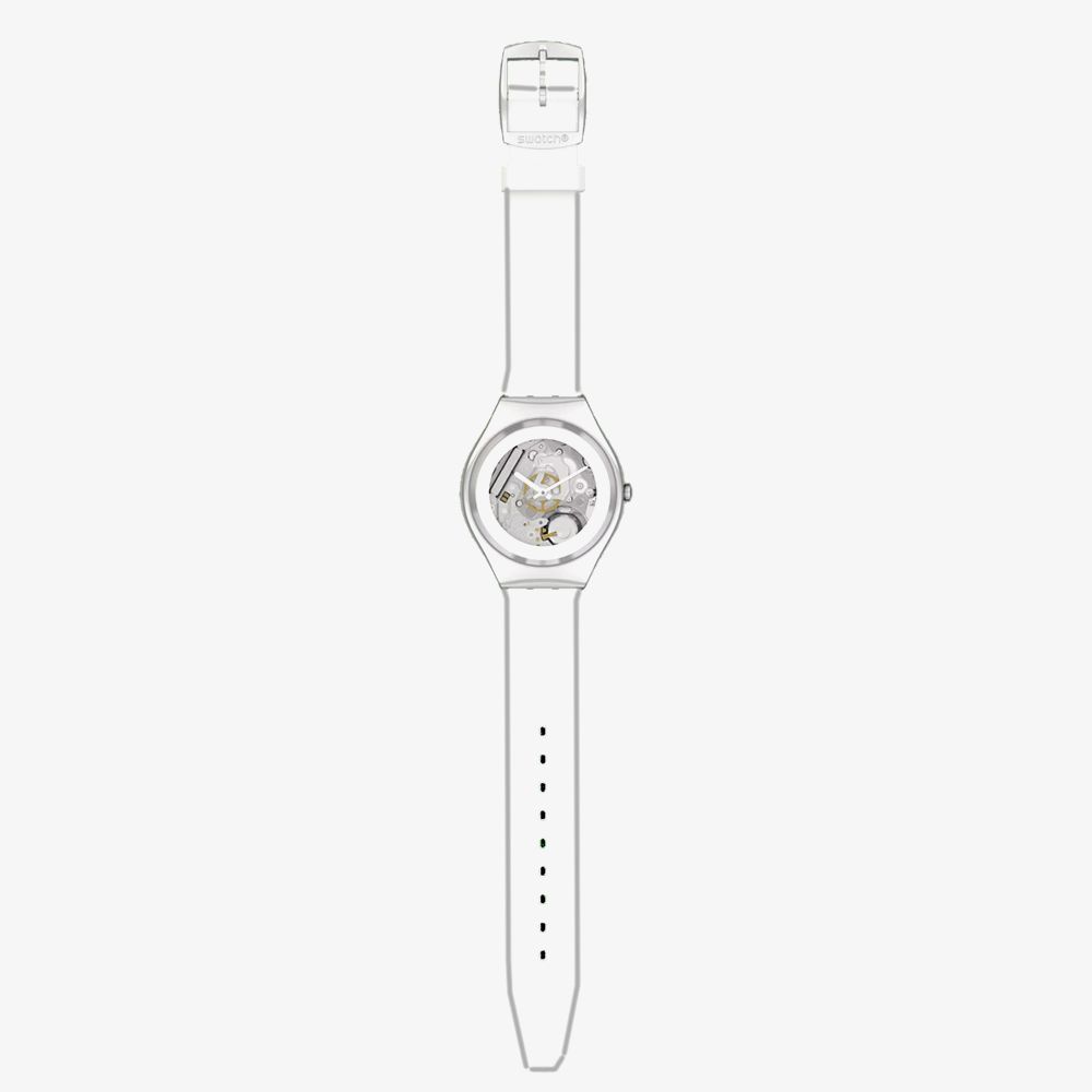 The Swatch SYXS138 watch combines a 38mm round shaped stainless steel case and white rubber strap with a traditional buckle. It has a silver analogue dial with luminescent hands which is protected beneath mineral crystal glass. Power is generated by the quartz movement. This model also has a water resistance of up to 30 metres.