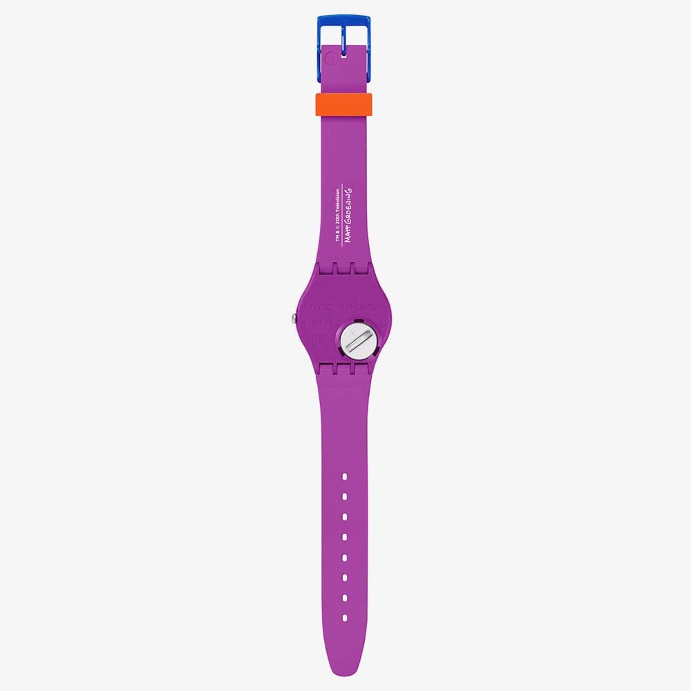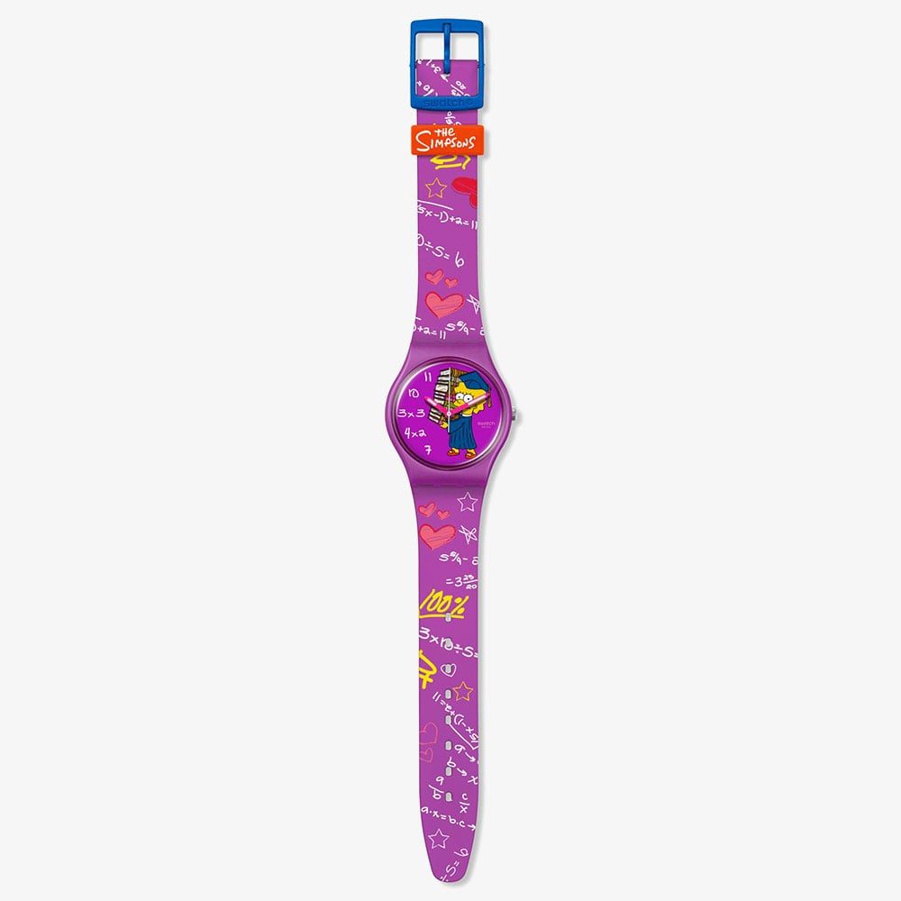 Part of The Simpsons Collection, this playful Graduation Day Special watch features Lisa carrying a stack of books on the dial. It has a purple bio-sourced case with bio-sourced glass, a purple strap with a multi-coloured print, a red loop with The Simpsons logo, and a dark blue buckle.