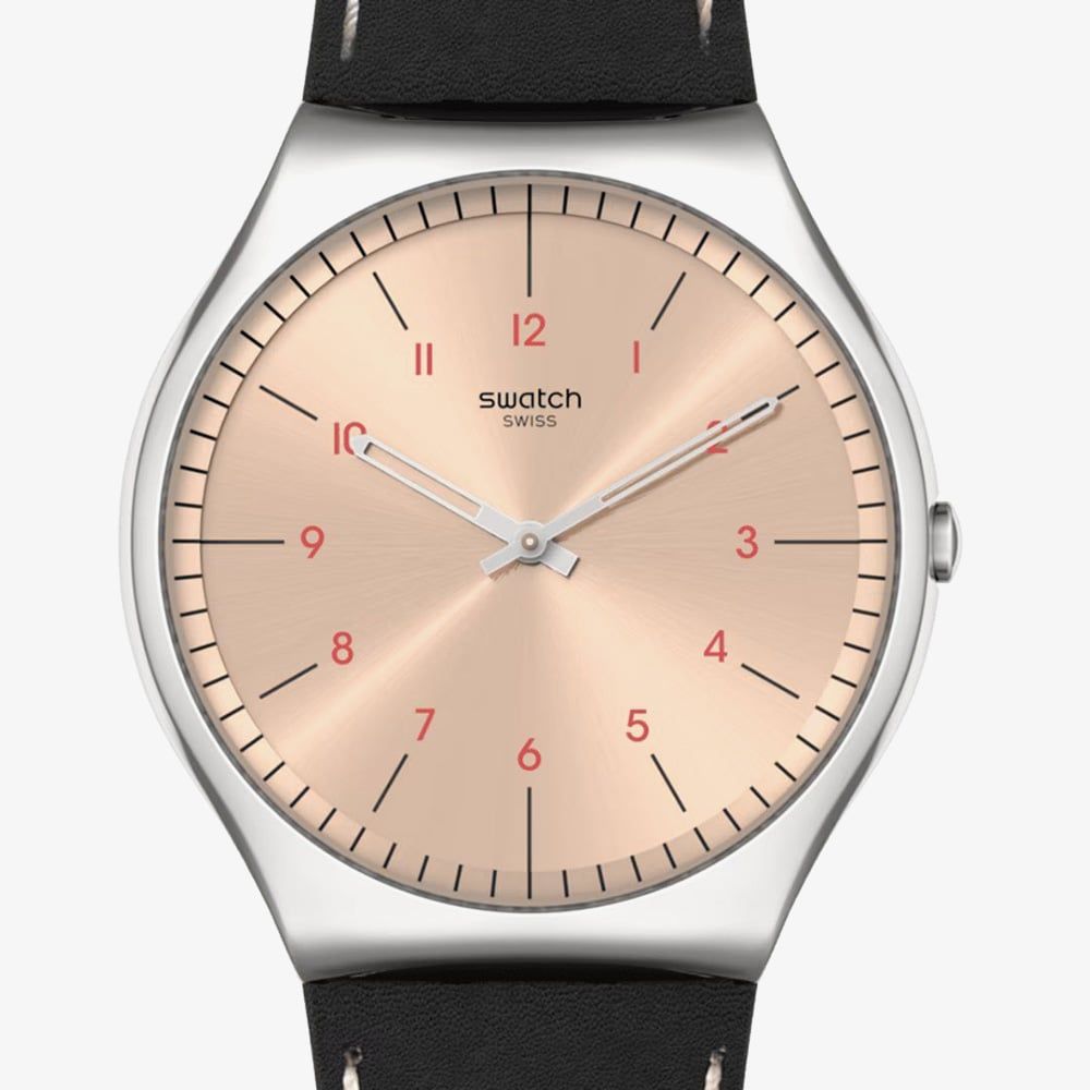 Sleek and contemporary, the Swatch Smart Stitch features a slim stainless steel case paired with a smooth black leather strap for understated elegance. Lightweight and versatile, this Swiss-made timepiece blends modern design with everyday comfort, making it a stylish choice for any occasion.
