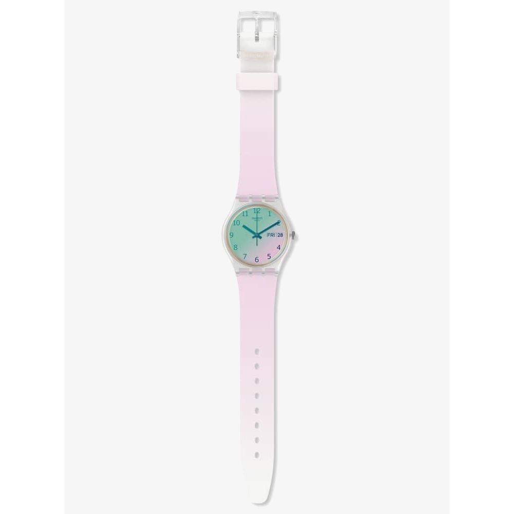 The stunning Ultrarose features a bubblegum pink semi-transparent strap. The strap is embellished with a perfectly pink print. Finished with a Swatch Solar Spectrum glass and a contrasting white dial with a grey print.