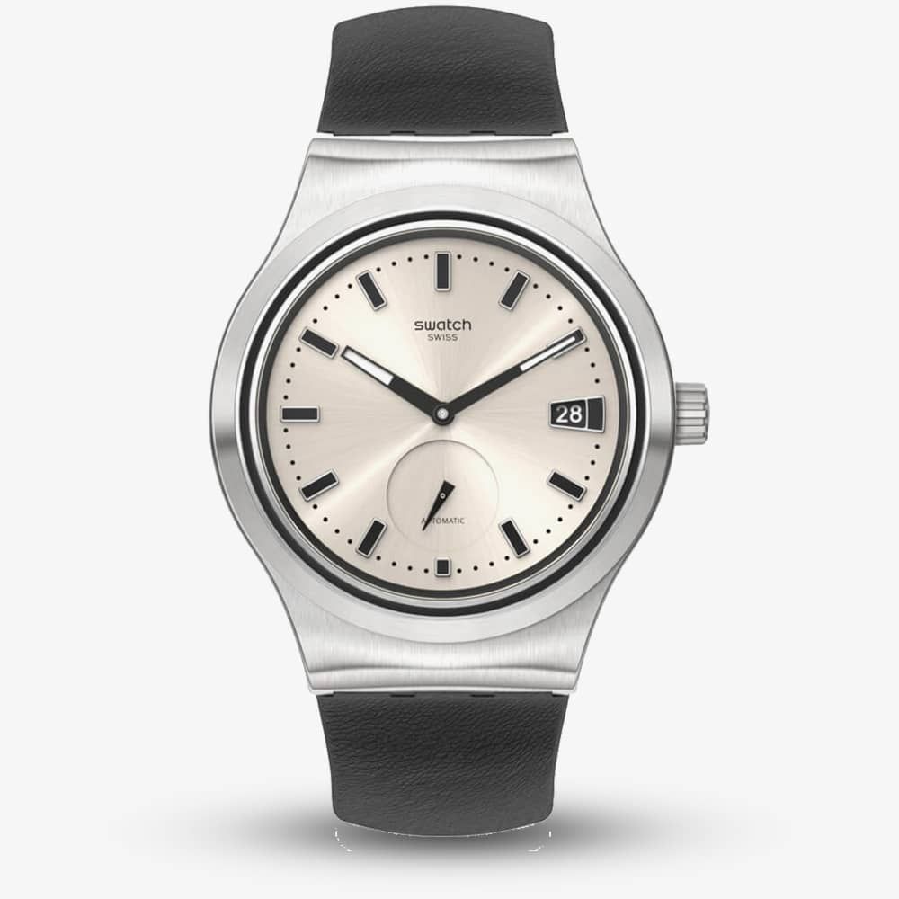 The Swatch SY23S408 Unavoidable watch combines a 42mm round shaped stainless steel case and black leather strap with a traditional buckle. It has a champagne coloured analogue dial with luminescent hands, a date display, and a small seconds sub-dial, all of which is protected beneath plastic glass. Power is generated by the automatic movement. This model also has a transparent case back and a water resistance of up to 30 metres.