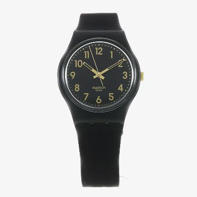 This solid black watch from Swatch is made from plastic ensuring comfort and durability. The black dial features gold coloured numeral hour markers and the brand name. This gorgeous watch is sure to make the perfect gift for your loved one.