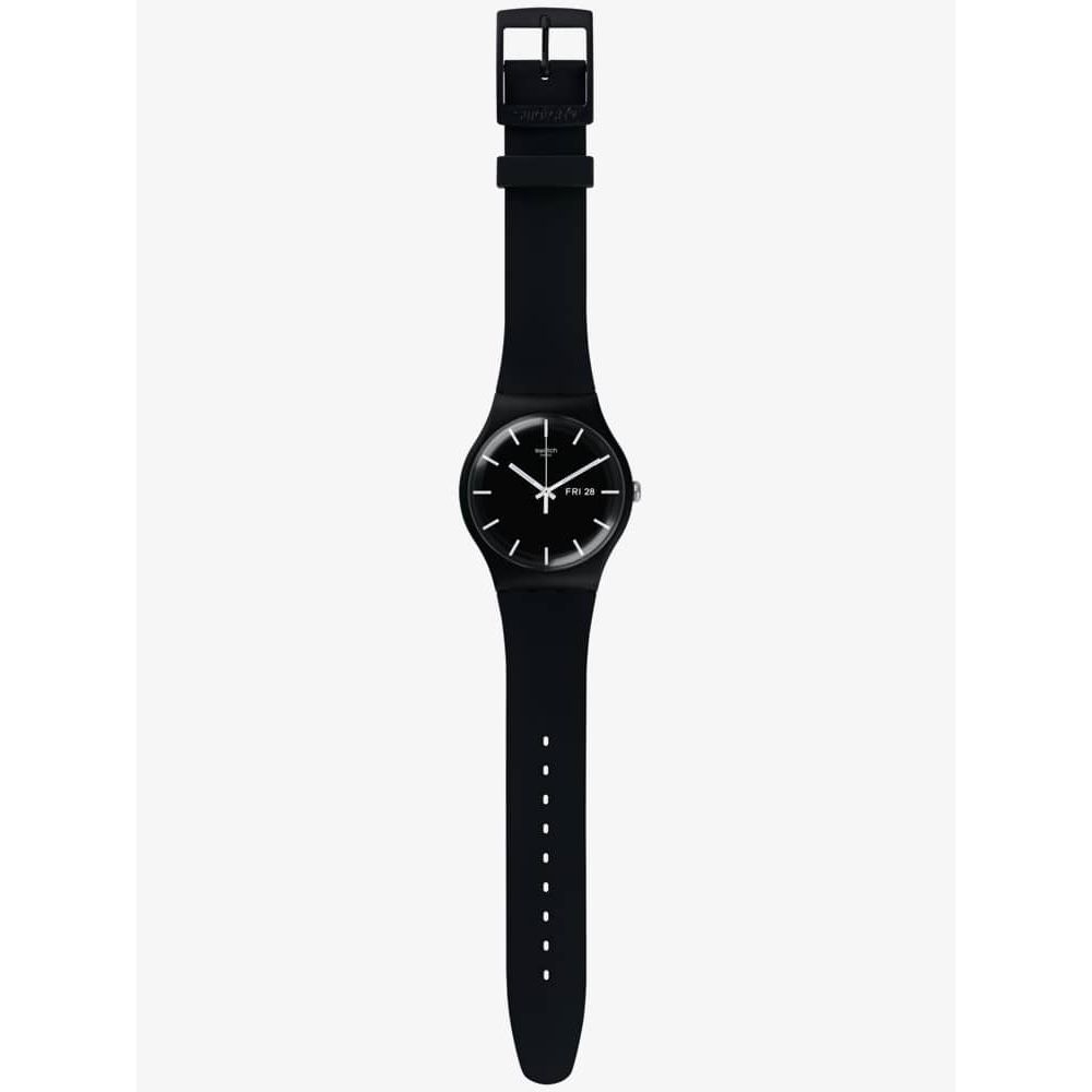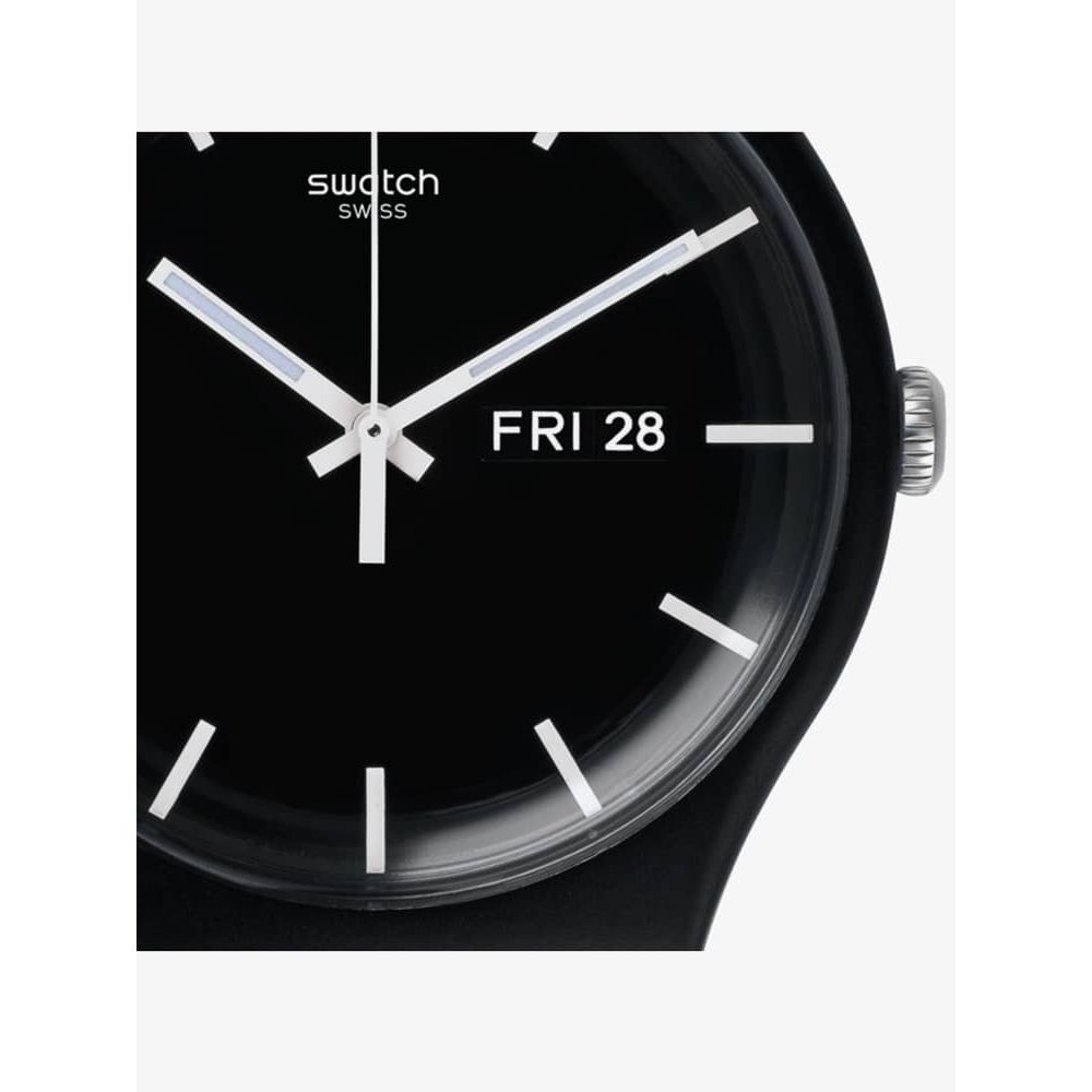 The Swatch Power Tracking Mono Black Watch S029B704 combines a 41mm round-shaped black plastic case and black silicone strap with a traditional buckle. This watch has a black mirror-effect analogue dial, featuring two superluminova luminescent hands with the date and day visible at position three, protected beneath the plastic glass. Power is generated by the Swiss quartz movement. This model also has a water resistance of up to 30 metres.