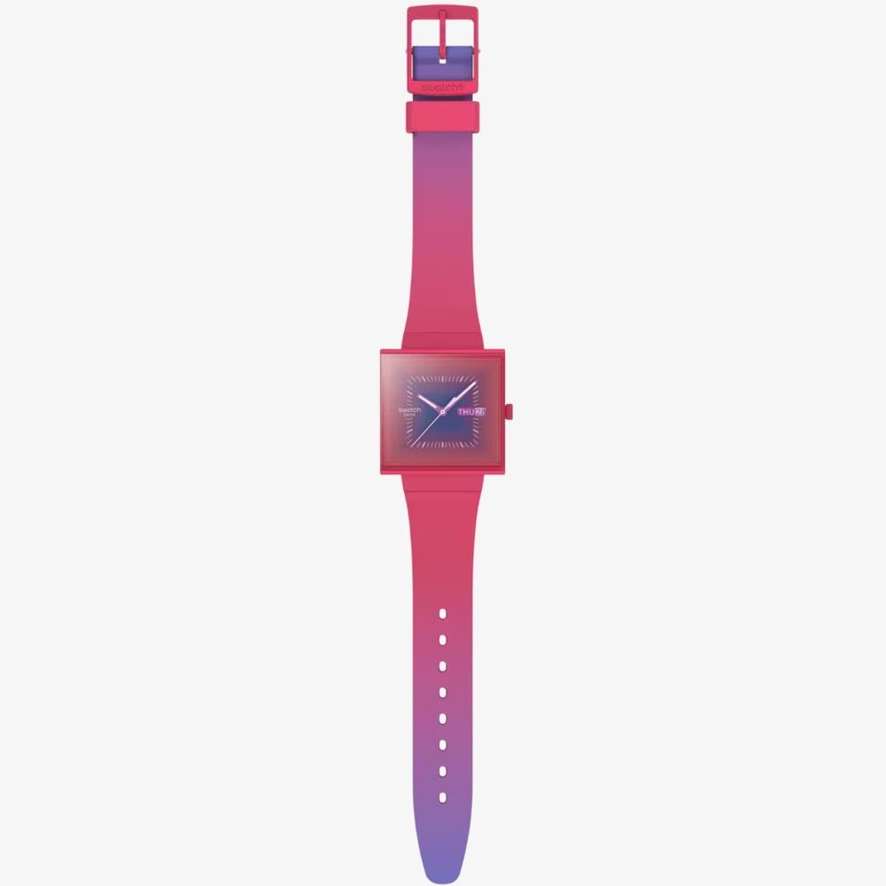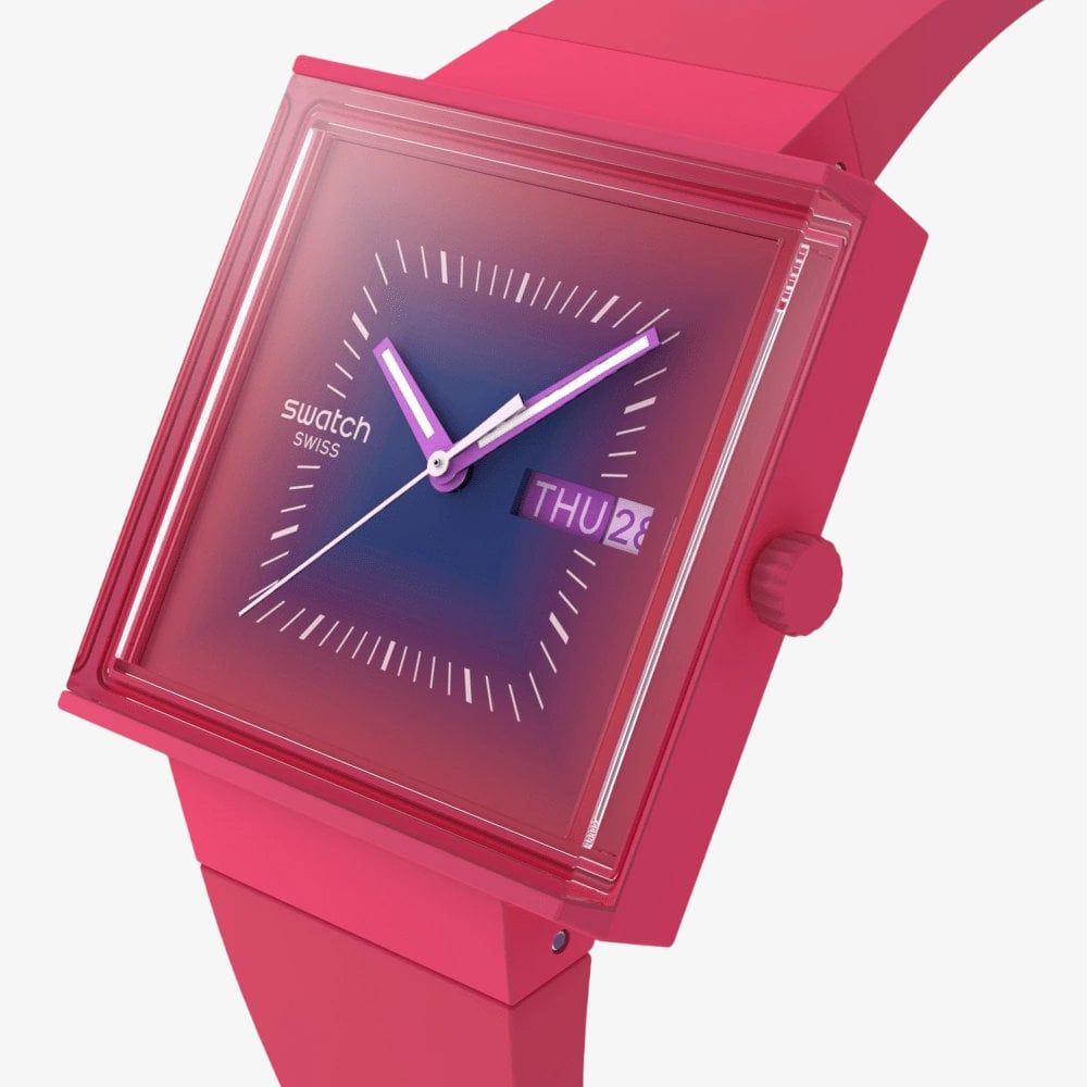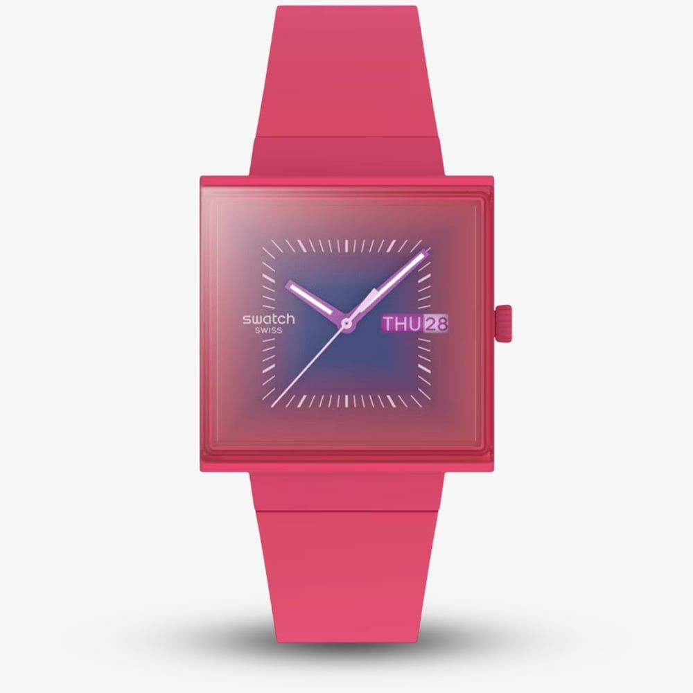 Embrace your playful side with this unique watch. This vibrant timepiece is a burst of personality with its eye-catching berry pink hue and unique square case. The playful design adds a touch of fun to any outfit, making it the perfect accessory for those who want to express their individuality.