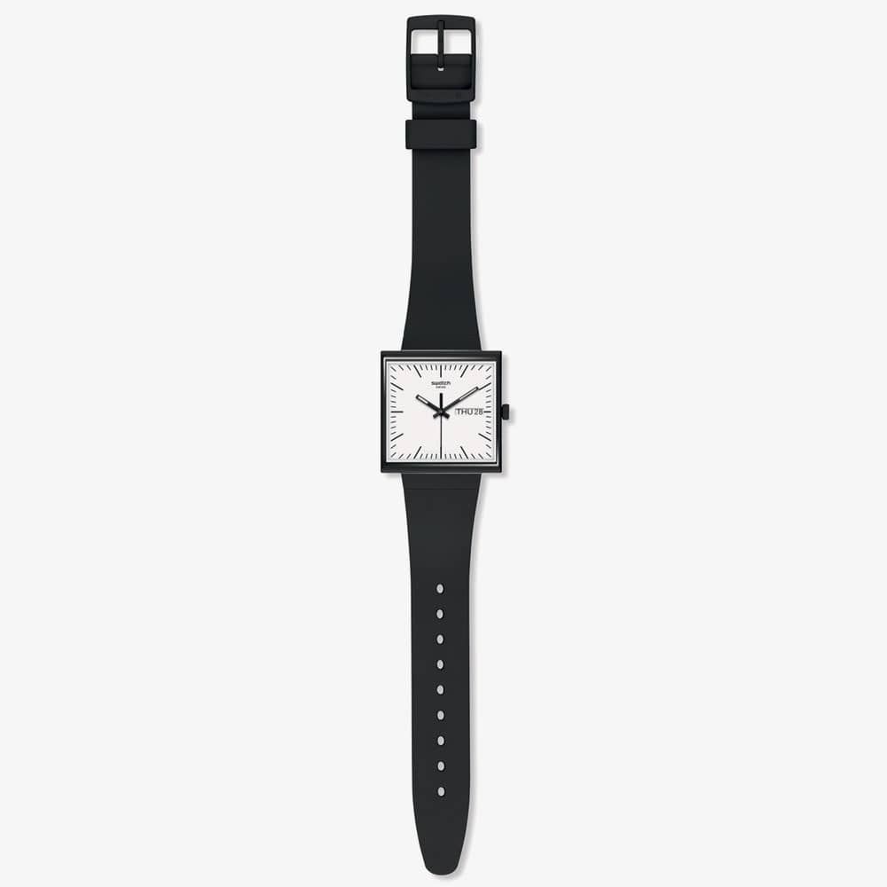 Crafted with a square bioceramic case, this watch showcases edge-to-edge biosourced glass, granting a glimpse of the indexes from the side. An integrated biosourced strap complements the dial, while the printed battery cover on the back features a watch face that inspired this black square timepiece.