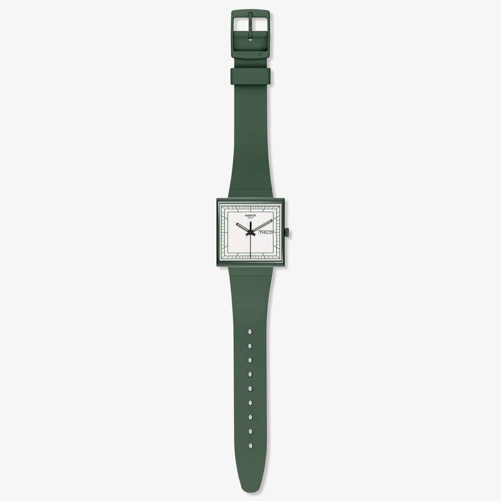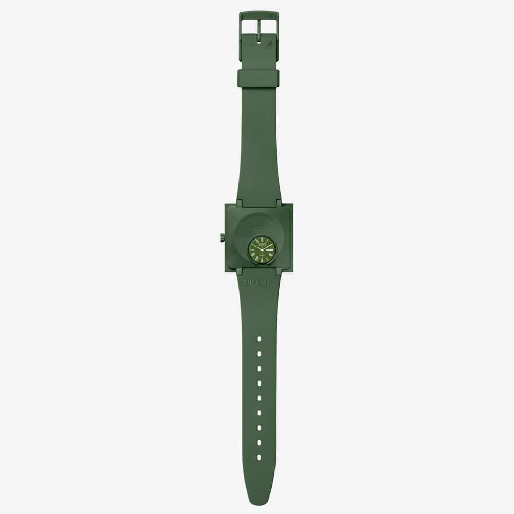Crafted with a square bioceramic case, this watch showcases edge-to-edge biosourced glass, granting a glimpse of the indexes from the side. An integrated biosourced strap complements the dial, while the printed battery cover on the back features a watch face that inspired this green square timepiece.